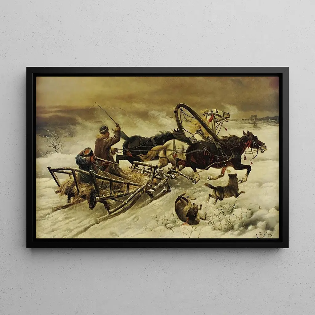 The art print of Wolf Hunt is an ideal decorative piece to enhance your interior, whether in a living room, office, or bedroom. Its print quality and fidelity to the original colors guarantee an impressive aesthetic rendering. This painting attracts attention and sparks conversations, while adding a touch of wild nature to your decor. By choosing this canvas, you opt for a work that combines beauty, history, and a lively atmosphere, perfect for all art and nature enthusiasts.