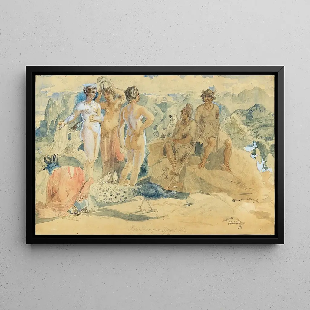 The Judgment of Paris: a mythological drama in colors "The Judgment of Paris" is a captivating art print by Holger Roed, depicting a key moment from Greek mythology. In this vibrant scene, Paris, the Trojan prince, faces three goddesses, each claiming to be the most beautiful. The rich colors and meticulous details create an atmosphere that is both dramatic and enchanting. Roed's technique, blending realism and romanticism, brings the characters and their emotions to life, immersing the viewer in a mythological story where beauty and desire are at the heart of the conflict. Holger Roed: an artist at the crossroads of styles Holger Roed, active in the 19th century, is a Danish painter whose work is rooted in the Romantic movement. Influenced by the great masters of classical painting, Roed skillfully incorporated elements of mythology into his compositions, making them accessible to a contemporary audience. His work reflects the concerns of his time, when interest in Antiquity and mythological stories was booming. As an artist, he contributed to the rediscovery of these themes while adding a personal touch to his interpretation of ancient stories. A decorative piece with multiple assets The art print of "The Judgment of Paris" is a decorative piece that will add a touch of elegance and culture to your interior. Whether in a living room, office, or bedroom, this artwork will captivate attention and spark conversations. Its faithful print quality and aesthetic appeal make it an ideal choice for art lovers and mythology enthusiasts. By integrating this canvas into your decor, you give your space an artistic and narrative dimension, enriching your daily environment.