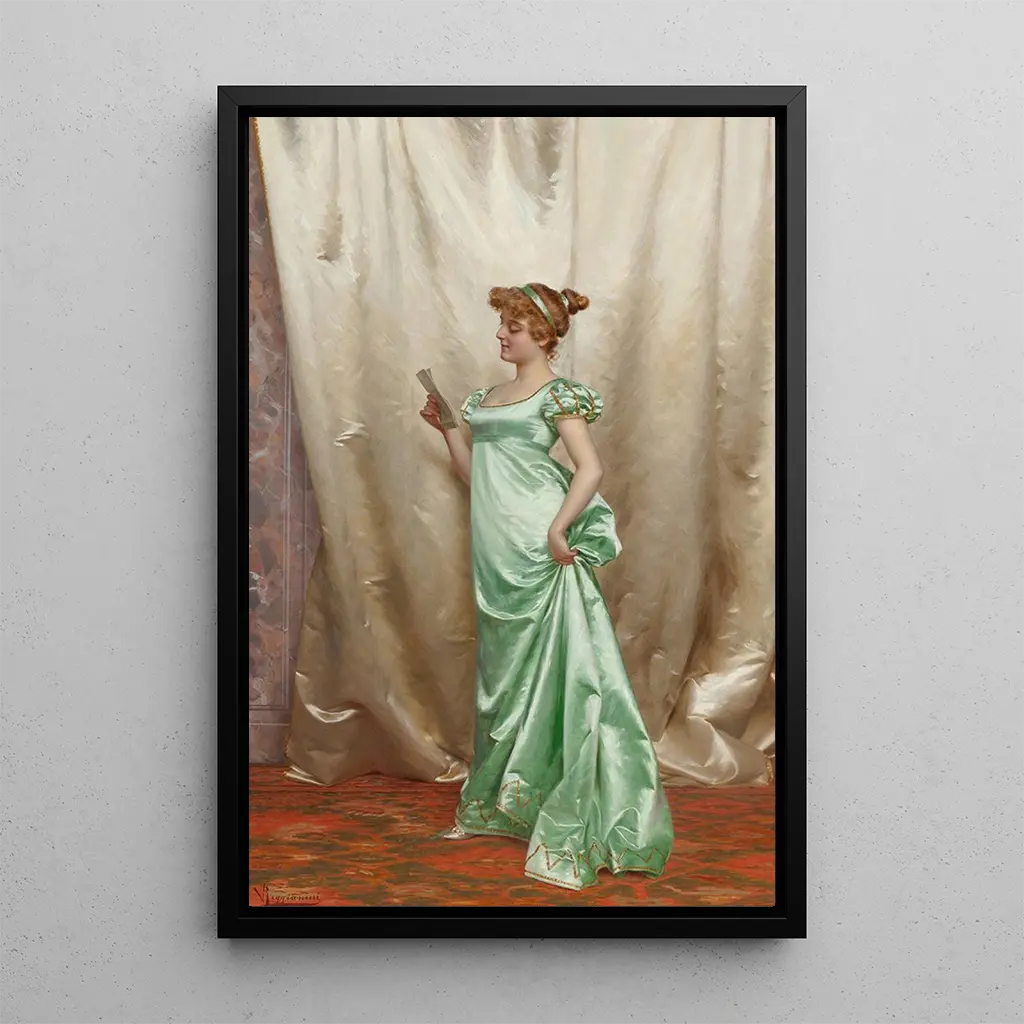 In this art print of The Love Letter, Vittorio Reggianini captures a moment of intimacy and tenderness. The scene depicts an elegant woman, dressed in a sumptuous gown, writing a letter with a delicate quill. The warm colors and play of light create a soft, nostalgic atmosphere, inviting the viewer to immerse themselves in the romantic universe of the late 19th century. Reggianini's mastery of pictorial technique, with its meticulous details and skillful use of shadows, brings this work to life, conveying the palpable emotion of the moment.