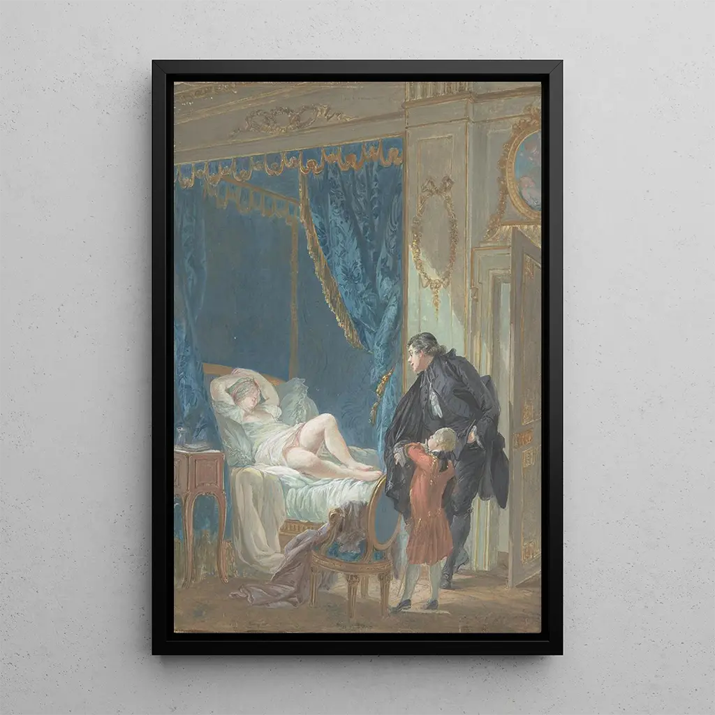 The art print Le Matin by Pierre-Antoine Baudouin evokes a gentle morning atmosphere, where light delicately filters through the trees. The pastel colors, blending shades of sky blue and tender green, create a soothing harmony. The watercolor technique, used with finesse, captures the transparency of the fresh morning air. The composition, centered on a bucolic landscape, invites the viewer to immerse themselves in the serenity of nature. Every detail, from the leaves to the reflections on the water, demonstrates meticulous attention, making this art print of Le Matin particularly captivating.