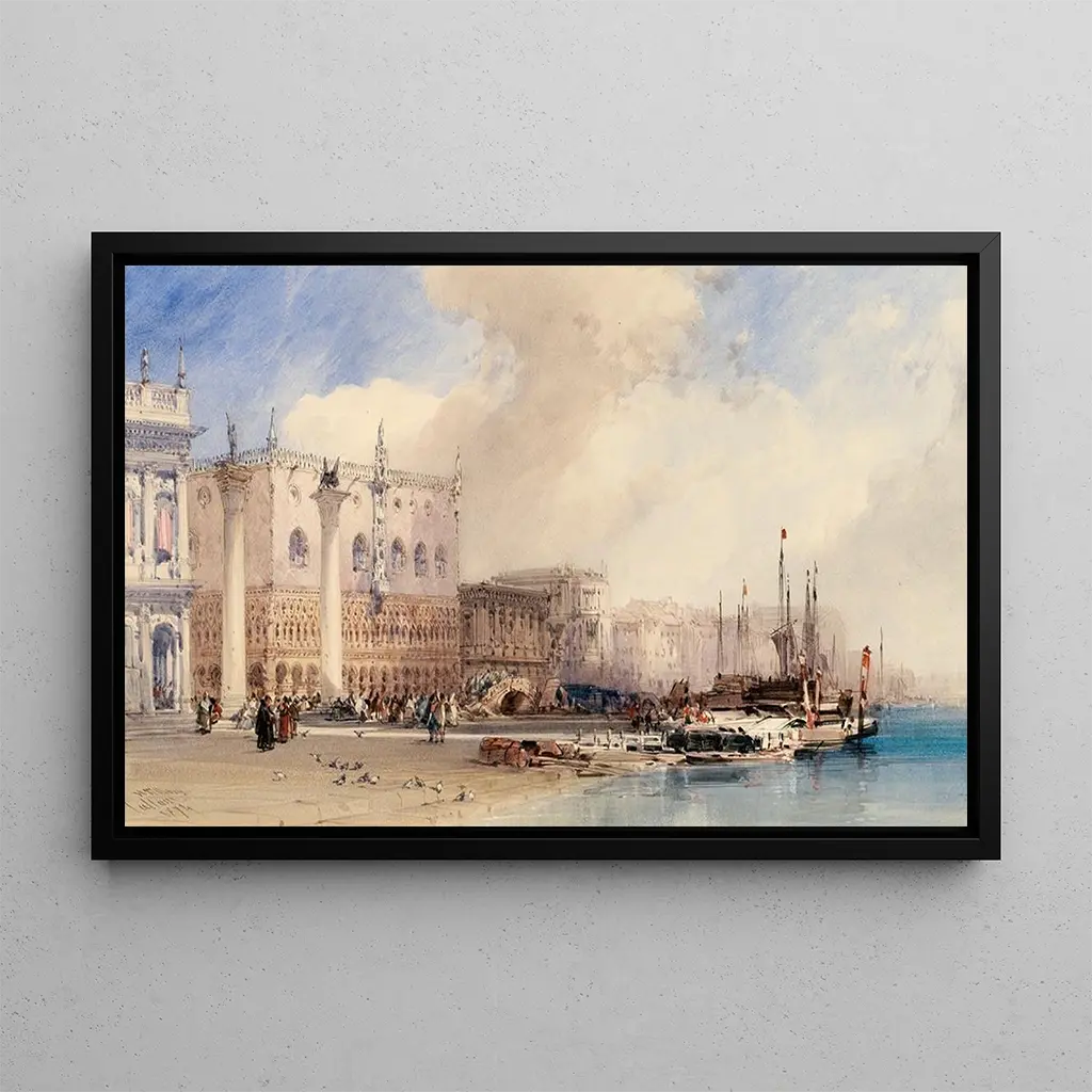 The artwork "Venice's Doge's Palace" by William Callow captures the very essence of Venetian serenity. The composition highlights the majestic architecture of the palace, bathed in a golden light that evokes the reflections of the canals. Shades of blue and beige blend harmoniously, creating an atmosphere that is both peaceful and vibrant. Callow employs oil painting techniques that bring architectural details to life while infusing an emotional depth into the scene. This art print invites the viewer to immerse themselves in the timeless elegance of Venice, where every brushstroke tells a story.
