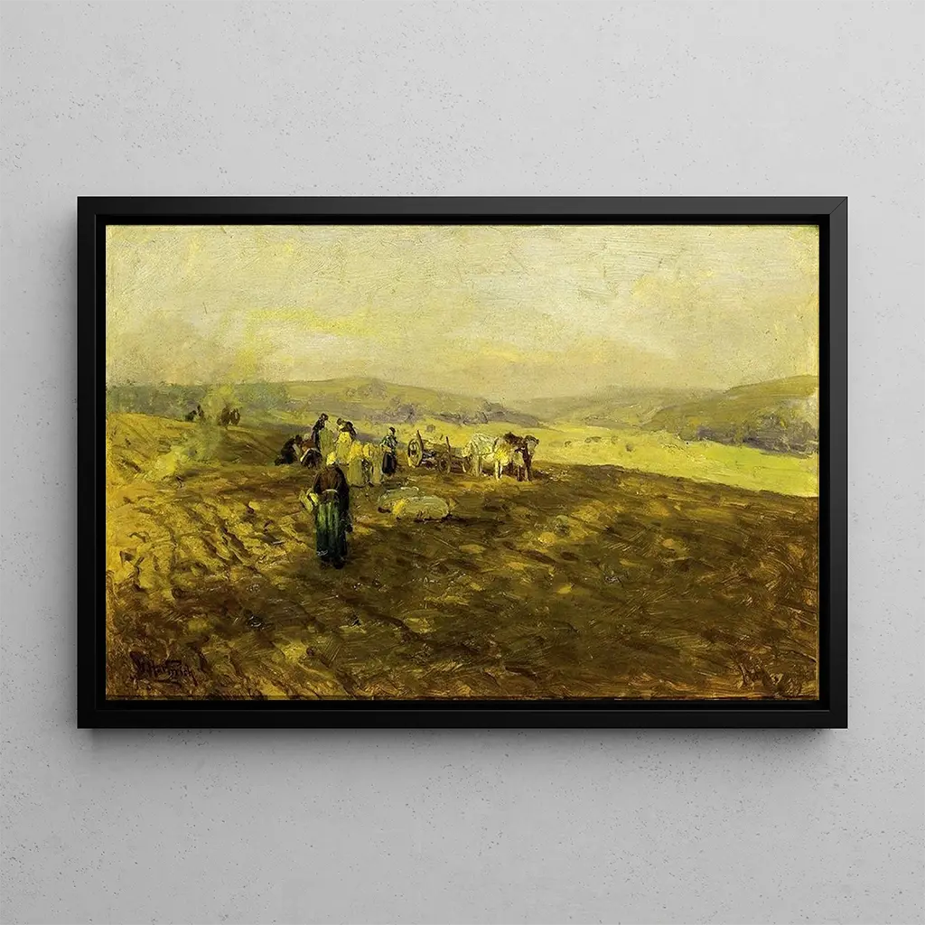 La reproduction de Les glaneuses de pommes de terre nous transporte dans un tableau empreint de réalisme et de simplicité. Les couleurs terreuses, mêlant des nuances de brun et de vert, évoquent le labeur des paysans dans les champs. La technique de la peinture à l'huile permet de rendre avec précision les textures des vêtements et des éléments naturels. L'atmosphère qui se dégage de cette œuvre est à la fois mélancolique et pleine de dignité, mettant en lumière la vie des glaneuses, figures souvent oubliées de la société.