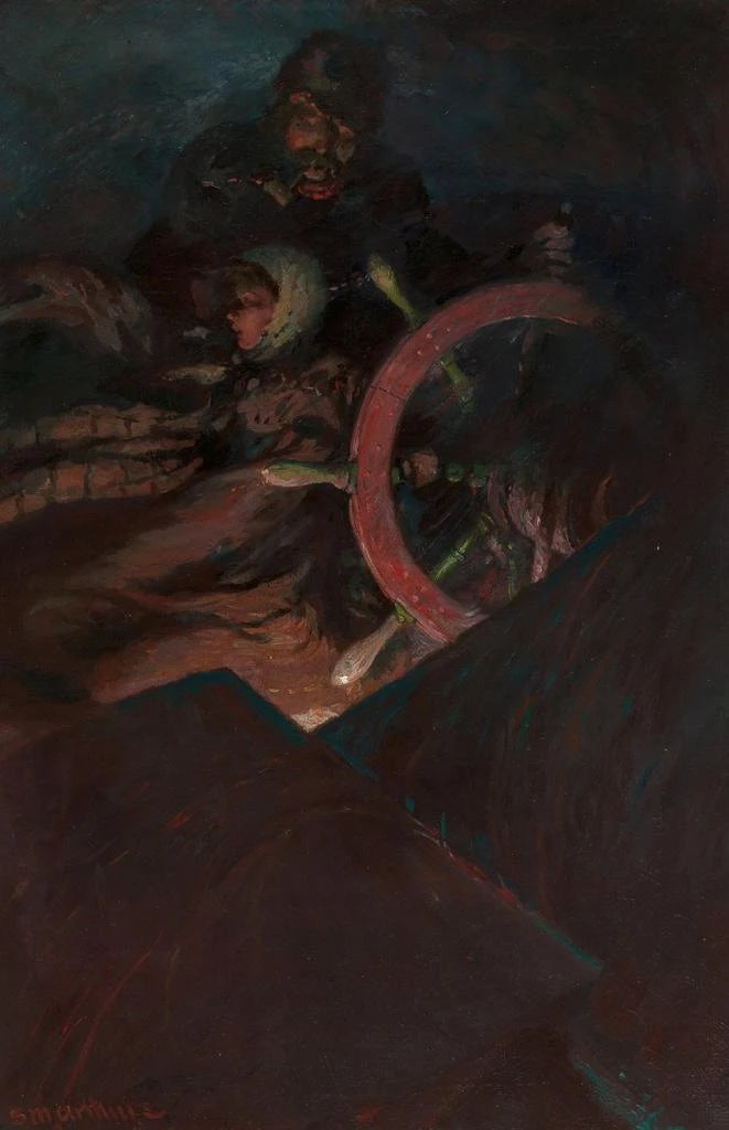 "Le Naufrage de l'Hespérus" est une œuvre emblématique qui plonge le spectateur dans une scène de désespoir et de lutte contre les éléments. Stanley Massey Arthurs, avec une maîtrise impressionnante de la lumière et des ombres, dépeint un navire en perdition, pris dans une tempête déchaînée. Les vagues tumultueuses et le ciel orageux créent une atmosphère dramatique, tandis que les figures des marins, figées dans des poses de désespoir, renforcent l'intensité émotionnelle de la scène. La technique de peinture, à la fois réaliste et expressive, permet de ressentir la puissance de la nature et la fragilité de l'homme face à elle.