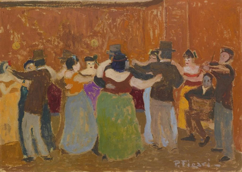 In "Le Cabaret Tango," Pedro Figari immerses us in the vibrant and passionate universe of Argentine tango. The characters, dressed in flamboyant costumes, seem to come to life under the artist's brush, while warm colors and dynamic shapes evoke music and movement. Figari, with his oil painting technique, manages to capture the energy and sensuality of this iconic dance, creating a festive and enchanting atmosphere that transports the viewer to the heart of Argentine culture.