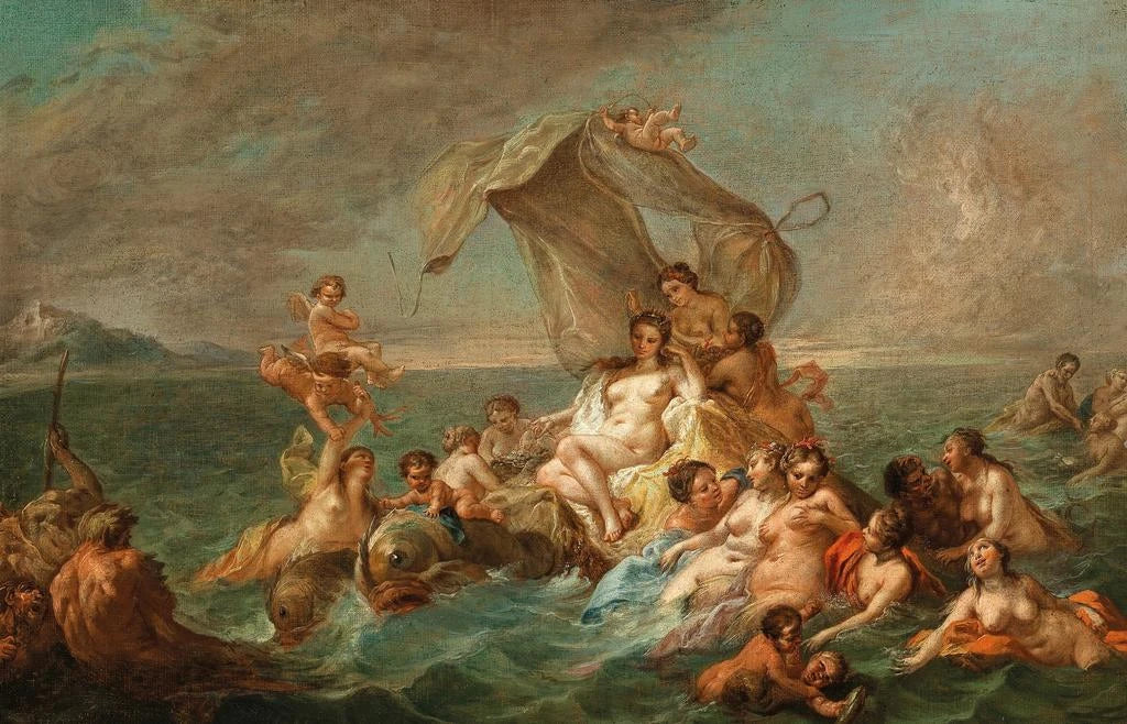 The Triumph of Galatea is a work that evokes Greek mythology through a dynamic and vibrant composition. Pastel colors intertwine to create a light and enchanting atmosphere, while the figures of Galatea and her companions seem to dance across the canvas. The technique of the French School, characterized by particular attention to detail and light, gives this scene an almost lifelike dimension. The radiant faces and flowing draperies reinforce the idea of a celebration of love and beauty, transporting the viewer into a world of dreams and legend.