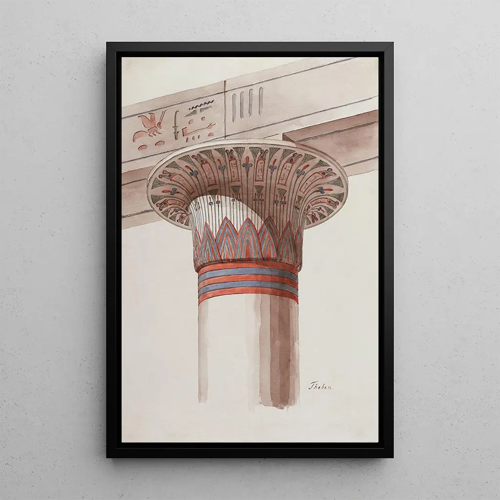 This art print of a temple capital from Thebes evokes the grandeur and sophistication of Egyptian architecture. The floral motifs and elegant lines testify to exceptional craftsmanship, while the natural colors recall the materials used in temple construction. The atmosphere conveyed by this piece is imbued with mystery and majesty, inviting the viewer to delve into the fascinating history of ancient Egypt. The finesse of the details and the precision of the forms make this canvas a true masterpiece, capturing the essence of antique art.