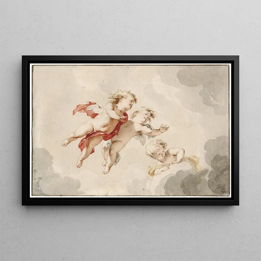 Three flying putti: a celestial dance full of lightness In this captivating art print, Jacob de Wit transports us to an airy universe where three putti, these charming little angels, seem to float gracefully. The composition is a true ballet of pastel colors, where soft shades of pink, blue, and cream blend harmoniously. The oil painting technique captures the delicacy of the faces and drapery, creating an atmosphere that is both joyful and dreamy. Every detail, from the expressions of the putti to the nuances of the shadows, contributes to the impression of a scene suspended in time, inviting the viewer to marvel at this divine lightness. Jacob de Wit: a master of Dutch rococo Jacob de Wit, active in the 18th century, is recognized as one of the leading representatives of rococo style in the Netherlands. Influenced by the great masters of his time, he developed a unique artistic language, combining finesse and exuberance. His career, marked by numerous commissions for palaces and churches, testifies to his importance in the European artistic landscape. His works, often populated with mythological figures and allegorical scenes, reflect an era when art was meant to be both decorative and narrative, capturing the collective imagination of his time. A decorative art print with multiple assets The reproduction of "Three flying putti" proves to be an ideal decorative choice for various spaces such as the living room, office, or bedroom. Its soft palette and enchanting motifs bring a touch of serenity and elegance to any interior. The quality of the art print guarantees remarkable fidelity to the original artwork, allowing you to enjoy its aesthetic appeal without compromise. By integrating this canvas into your decor, you offer your space a refined artistic note, while inspiring admiration from your guests.