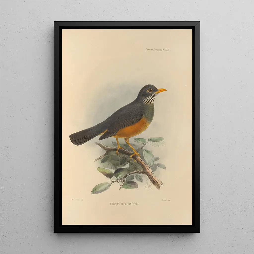 The reproduction of Turdus Tephronotus is a perfect decorative choice to bring a touch of nature into your interior. Whether in a living room, office, or bedroom, this art print will captivate attention and inspire admiration. Its printing quality guarantees fidelity to the colors and details of the original, making this piece a true aesthetic asset. By integrating this canvas into your decor, you create a harmonious and soothing space, while celebrating the beauty of thrushes and the richness of our environment.