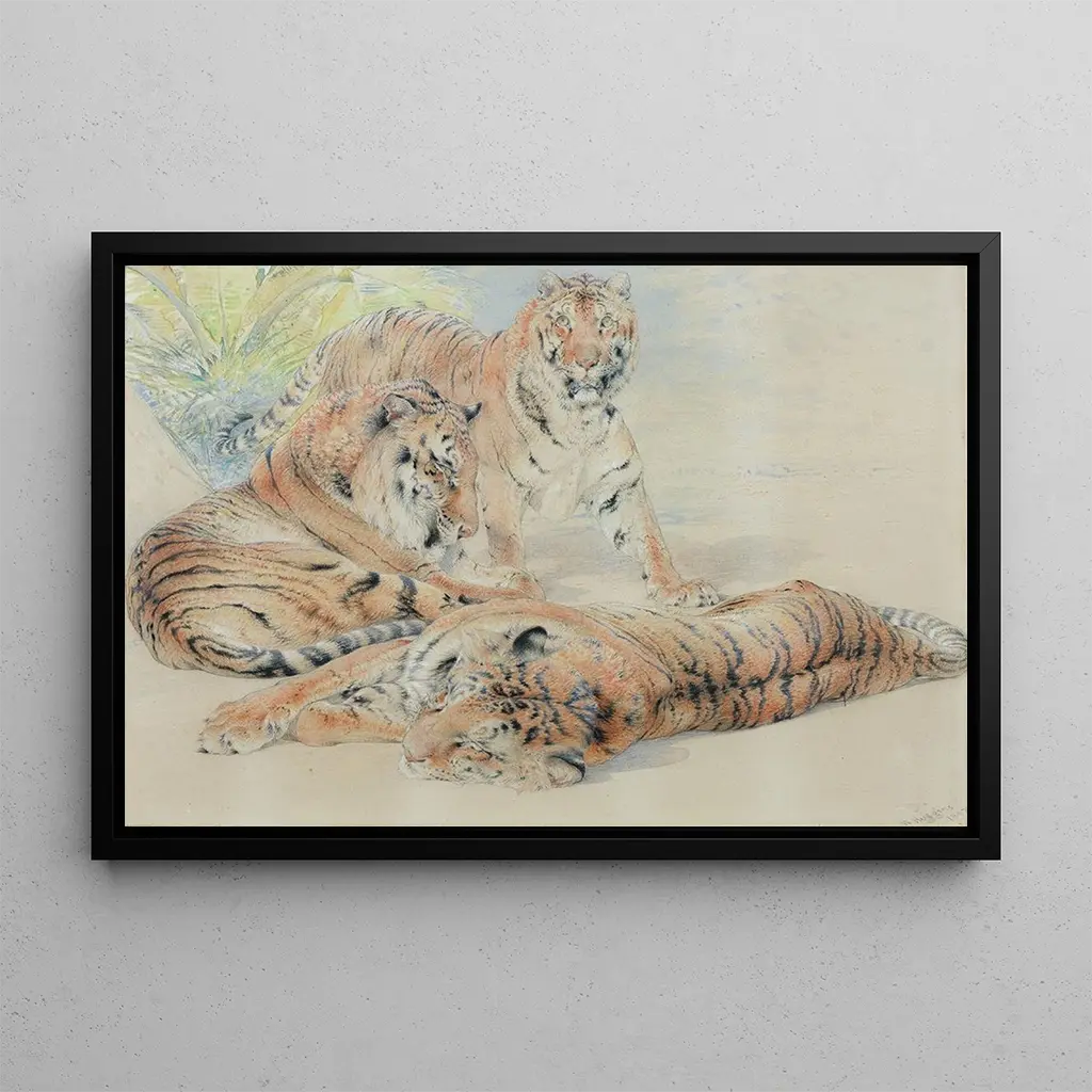 Study of Tigers: A Glimpse into Feline Majesty The artwork "Study of Tigers" by William Huggins captures the power and grace of these majestic felines. The warm, earthy colors, blended with touches of black and orange, evoke both the warmth of their natural habitat and the raw strength of these creatures. The artist's technique, which combines realism with a touch of expressionism, allows viewers to feel the intensity of the tigers' gazes. In this composition, every detail—from the stripes to the prominent muscles—is carefully rendered, creating an atmosphere that is both wild and captivating. William Huggins: a master of animal realism William Huggins, active in the 19th century, is renowned for his depictions of animals, particularly felines. Influenced by the scientific explorations of his time, he skillfully blended art with meticulous observation of nature. Huggins often collaborated with naturalists and zoologists, which enriched his understanding of animal behaviors. His style, rooted in realism, marked an era when fascination with wildlife was at its peak. "Study of Tigers" demonstrates his ability to capture not only the appearance but also the essence of these creatures. A decorative acquisition with multiple advantages Choosing the art print "Study of Tigers" for your interior is selecting a canvas that adds a touch of exoticism and sophistication. Whether in a living room, office, or bedroom, this piece draws the eye and inspires admiration. Its printing quality guarantees fidelity to the details of the original work, while offering a modern aesthetic. By integrating this art print into your decor, you create a space that evokes wild nature while remaining chic and elegant.