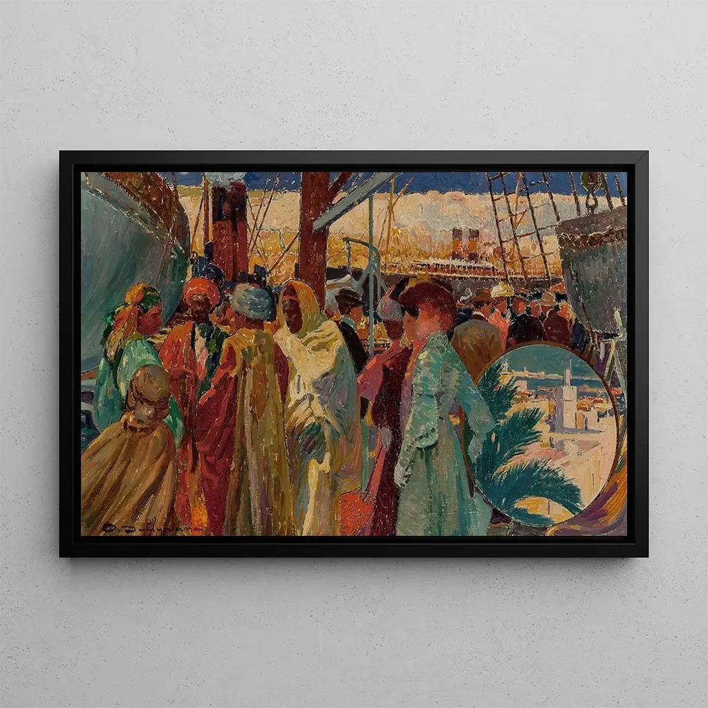Compagnie Transatlantique Algeria-Tunisia, an art print by David Dellepiane, evokes a nostalgic voyage across the seas. This art print, rich in detail, depicts a lively maritime scene, where ships coexist in a vibrant setting. The shimmering colors, ranging from deep blues to warm ochres, create an atmosphere that is both dynamic and welcoming. Dellepiane, with his mastery of light and shadow, manages to capture the essence of the era of great maritime crossings, inviting the viewer to immerse themselves in this adventure.