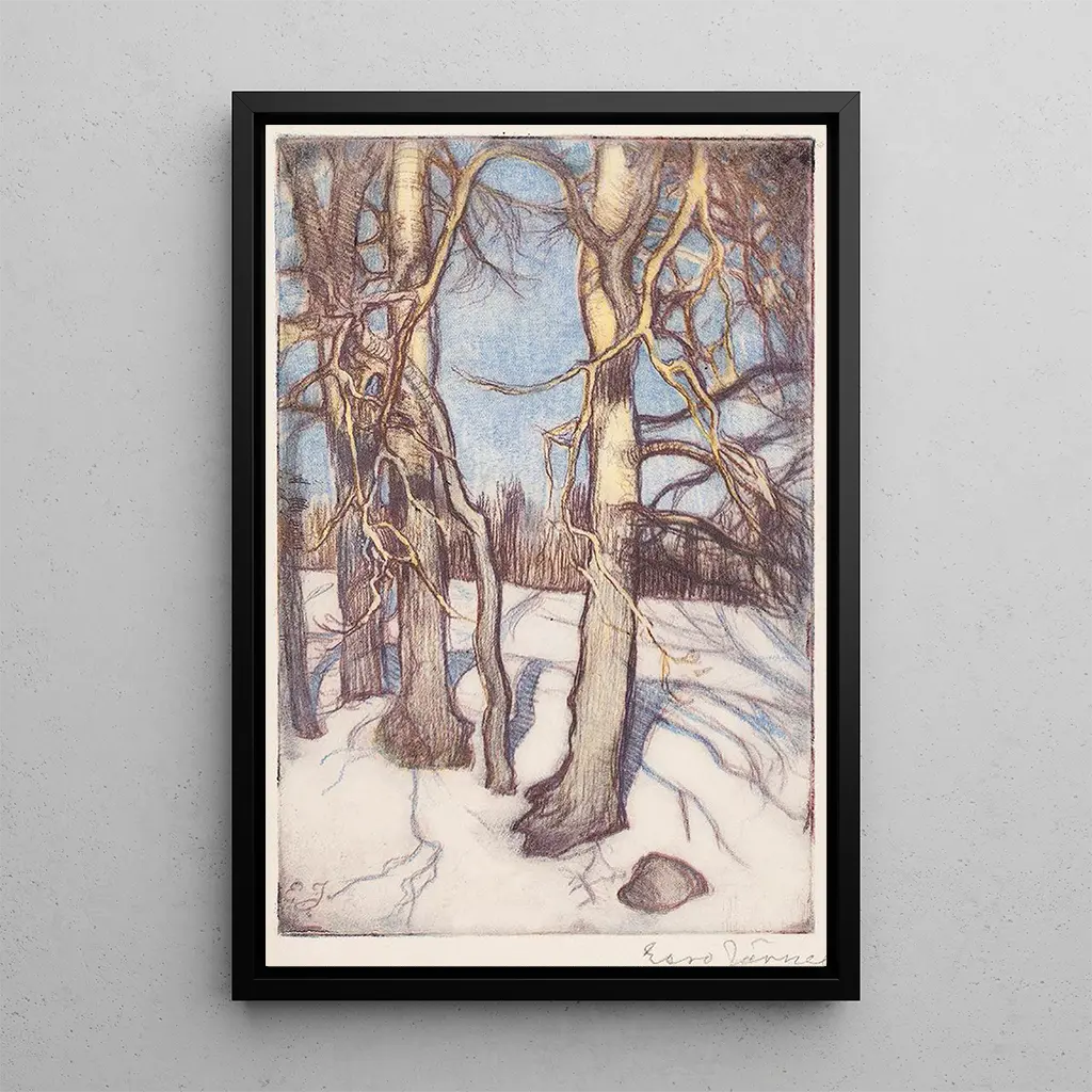 Trees in Winter: an icy and poetic serenity "Trees in Winter" by Eero Järnefelt evokes a winter landscape filled with calm and beauty. The canvas features bare trees, their branches extending towards a deep blue sky, creating a striking contrast with the pristine whiteness of the snow. The shades of gray and blue, combined with soft lighting, give the artwork an almost dreamlike atmosphere. Järnefelt, through his delicate technique, manages to convey the tranquility of a winter landscape, inviting the viewer to contemplation and reflection on the beauty of nature. Eero Järnefelt: a pioneer of Finnish landscape art Eero Järnefelt, an emblematic figure of Finnish art, played a crucial role in the evolution of landscape painting at the end of the 19th century. Influenced by Impressionism, he mastered blending tradition and modernity, offering a new vision of nature. His works, often inspired by Finnish landscapes, reflect a deep respect for the environment and a quest for harmony. "Trees in Winter" perfectly illustrates this approach, highlighting the austere beauty of Finnish winter and the importance of nature in his work. A decorative acquisition with multiple assets The art print of "Trees in Winter" is an ideal decorative choice to bring a touch of serenity to your interior. Whether in a living room, office, or bedroom, this canvas evokes peace and tranquility, while adding an artistic dimension to your space. The quality of printing ensures fidelity to the original artwork, allowing you to fully enjoy the beauty of the landscape. With its aesthetic appeal and capacity to inspire contemplation, this piece is a valuable addition to any art collection.