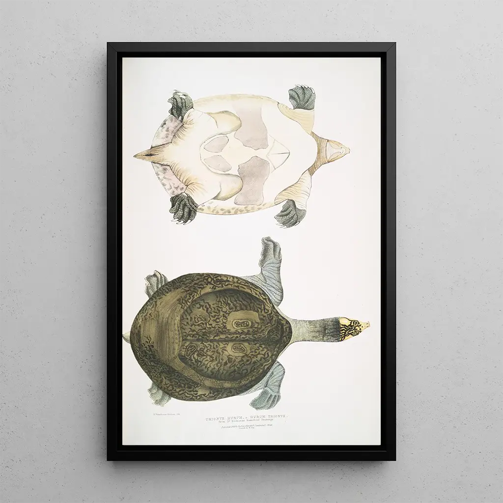 Trionyx Hurum art print: a dive into the aquatic universe The Trionyx Hurum art print invites us to explore the mysterious depths of rivers and lakes. This painting, created with meticulous technique, highlights the delicacy of the shapes and textures of this freshwater turtle. The shades of green and blue blend harmoniously, creating a soothing and contemplative atmosphere. The artist manages to capture the fluidity of aquatic movement, making the scene almost alive. Every detail, from the scales to the water's reflections, demonstrates attentive observation and great technical mastery. John Edward Gray: a pioneer of zoological illustration John Edward Gray, 19th-century British naturalist and zoologist, played a crucial role in documenting the world's fauna. His works, often produced for scientific publications, combine precision and aesthetics. Influenced by the discoveries of his time, Gray contributed to the classification of numerous species, becoming an iconic figure in zoological illustration. His style, both realistic and artistic, marked an era when science and art came together to educate the public about biodiversity. The Trionyx Hurum art print is a perfect example of his innovative approach. A decorative acquisition with multiple assets This Trionyx Hurum art print is an ideal decorative piece to enhance your interior, whether in a living room, office, or bedroom. Its print quality and fidelity to the original details make it an attractive choice for art and nature enthusiasts. By incorporating this painting into your decor, you add a touch of elegance and serenity to your space. The aesthetic appeal of this artwork, with its calming colors and captivating subject, makes it a central element that will inspire admiration from your guests.