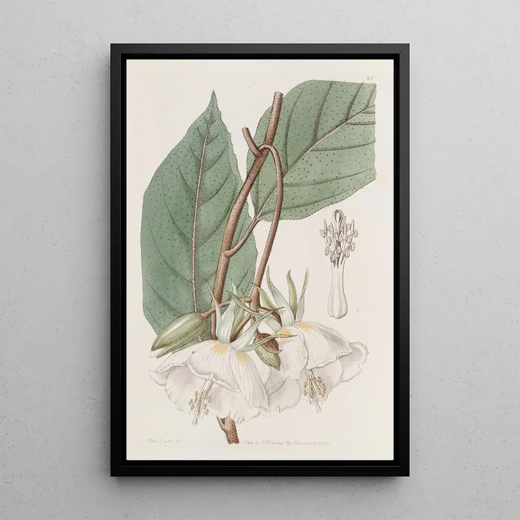 The art print of Trochetia with large flowers immerses us in a lush universe where nature expresses itself with brilliance. The vivid shades of red and green blend harmoniously, creating a vibrant and warm atmosphere. The watercolor technique, used by Sydenham Edwards, captures the delicacy of the petals while offering a fascinating depth. Every detail, from the leaf veins to the cast shadows, reflects a careful eye on the beauty of plants. This piece invites contemplation, evoking exotic landscapes and the richness of biodiversity.