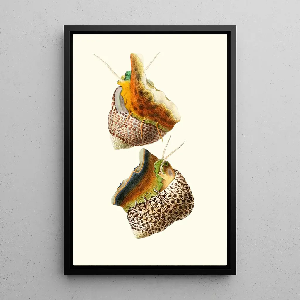 The art print of Trochus turbinas and Trochus articulatus immerses us in a fascinating marine universe. These shells, with their spiral shapes and shades of colors ranging from beige to brown, evoke the beauty of the seabed. The representation technique highlights the meticulous details of their texture, creating an atmosphere that is both soothing and intriguing. Each shell seems to tell a story, an invitation to explore the mysteries of the ocean and to appreciate the diversity of marine life.