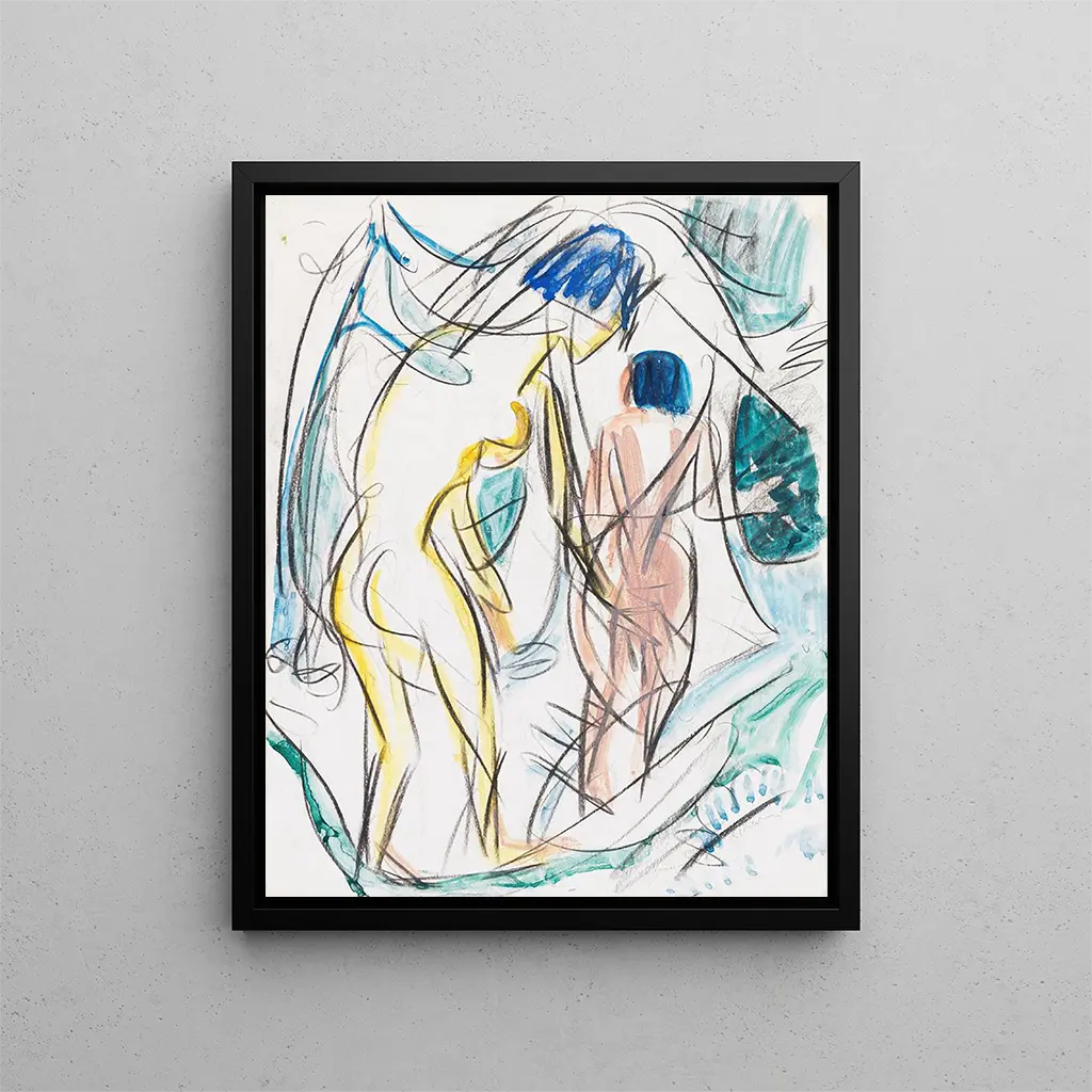 Captivating Introduction In the vibrant world of modern art, the art print "Deux actes dans la forêt" by Ernst Ludwig Kirchner stands out for its boldness and psychological depth. This painting, where nature and the human figure intertwine, invites the viewer to immerse themselves in a world where sensuality and spirituality coexist. Kirchner, a key figure of the expressionist movement, masterfully captures the essence of the human soul through stylized forms and vivid colors. The scene depicted, both intimate and universal, evokes a profound connection with nature and an exploration of human emotions, making this art print particularly moving and timeless. Style and uniqueness of the work "Deux actes dans la forêt" is characterized by a palette of flamboyant colors and dynamic lines that create an almost tangible movement. Kirchner uses bright hues to express the feelings of his characters, giving them an aura that is both sensual and melancholic. The female figures, nude and serene, blend harmoniously into the forest landscape, suggesting a symbiosis between man and nature. The treatment of forms, both simplified and expressive, reflects the influence of Fauvism while embodying the artist's personal artistic quest. The work, while rooted in tangible reality, transcends the everyday through its emotional and spiritual approach, thus echoing the existential concerns of the era. The artist and his influence Ernst Ludwig Kirchner, born in 1880, was one of the founders of the expressionist group Die Brücke, which played a major role in the evolution of art in the early 20th century. His artistic journey was marked by an unceasing quest for authenticity and personal expression, often as a reaction against academic conventions. Kirchner was deeply influenced by his travels in Switzerland and Italy, as well as by primitive culture, which he incorporated into his work to explore themes of life, death, and beauty. His unique style paved the way for many contemporary artists, and his impact is still felt today, both in the