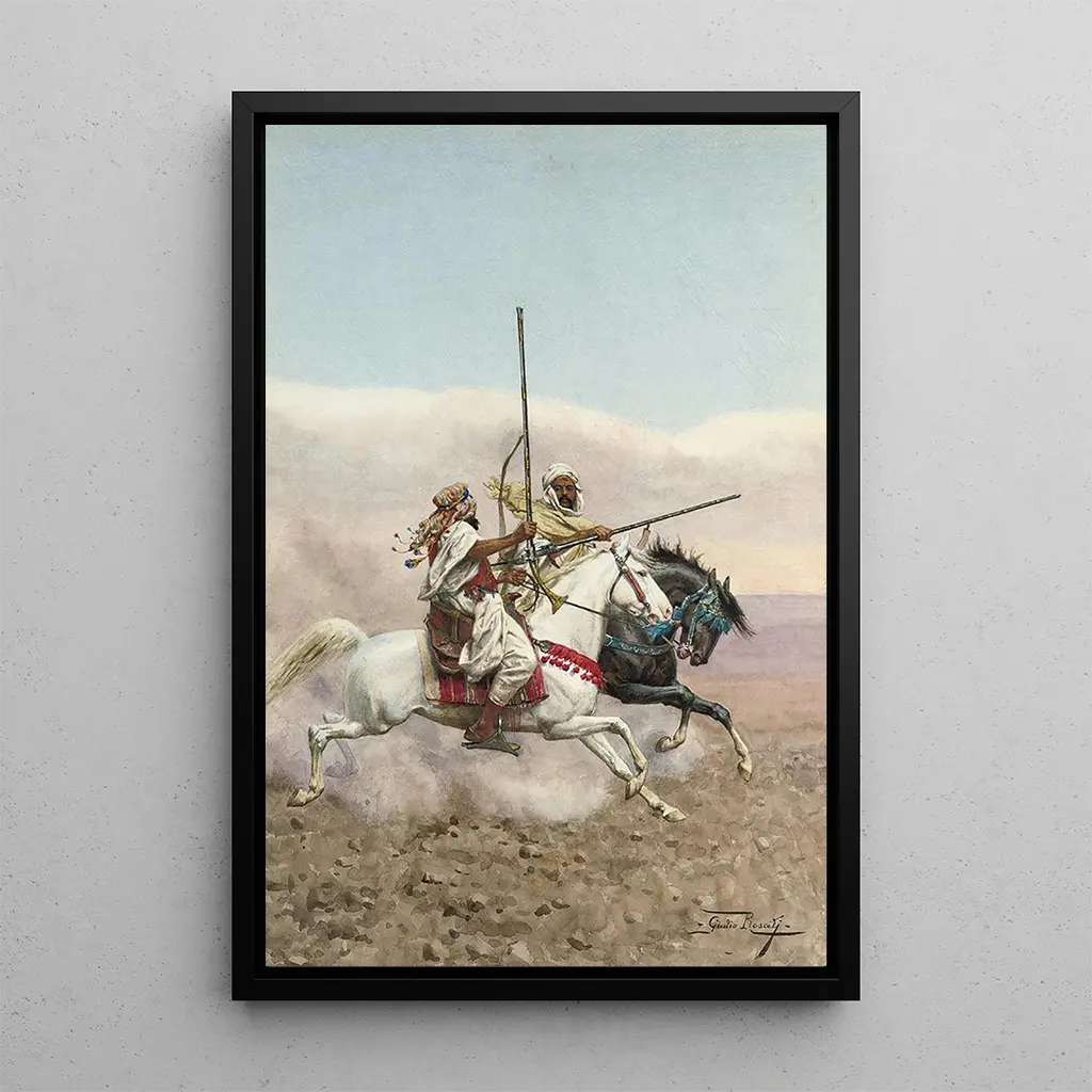 "Two Arab horsemen" by Giulio Rosati is a masterpiece that evokes the strength and majesty of horses, symbols of freedom and courage. In this composition, the riders, dressed in traditional costumes, seem to gallop gracefully through a desert landscape, where shades of sand and sky blend harmoniously. Rosati's technique, combining realism and dynamism, captures the movement of the horses and the intensity of the riders' gazes, creating an atmosphere that is both epic and poetic. This canvas invites you to dream of distant adventures and exotic landscapes.