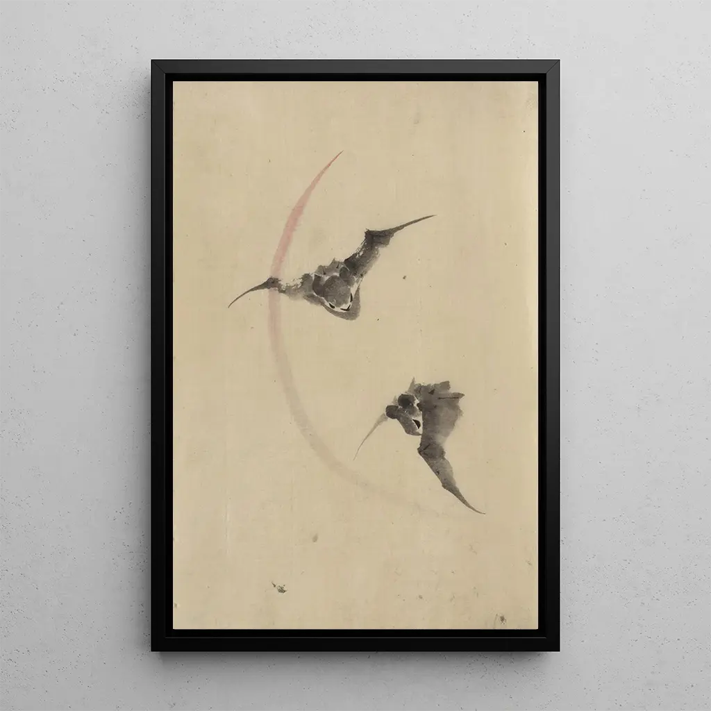 Two bats in flight: a mysterious nocturnal dance In this captivating artwork, Katsushika Hokusai immerses us in a nocturnal universe where two bats soar through the air. The composition is characterized by fluid, dynamic lines, evoking the graceful movement of these nocturnal creatures. The dark shades and nuances of gray create a mysterious atmosphere, while the delicate details of the wings add a touch of realism. Hokusai, master of Japanese ukiyo-e prints, manages to capture the very essence of these animals, symbols of luck and protection in Asian culture. This art print of Two bats in flight invites silent, fascinating contemplation. Katsushika Hokusai: the genius of Japanese ukiyo-e prints Katsushika Hokusai, born in 1760, is one of Japan’s most influential artists, recognized for his major role in the ukiyo-e movement. His career spans several decades, during which he explored various themes, ranging from landscapes to portraits and scenes of daily life. Hokusai was deeply influenced by nature and popular culture of his time, which is reflected in his work. His works, including the famous The Great Wave off Kanagawa, have left an indelible mark on Japanese art and inspired many Western artists. This art print of Two bats in flight continues this tradition, demonstrating his skill in blending technique and symbolism. A decorative acquisition with multiple assets This reproduction of Two bats in flight is an ideal decorative piece to enhance your interior, whether in a living room, office, or bedroom. Its print quality and fidelity to the original details make it a perfect choice for art and Asian culture enthusiasts. The artwork captures the eye and sparks curiosity, while adding a touch of elegance and mystery to your decor. By integrating this canvas into your space, you give your walls a story to tell, while enjoying an aesthetic element that is sure to impress your guests.