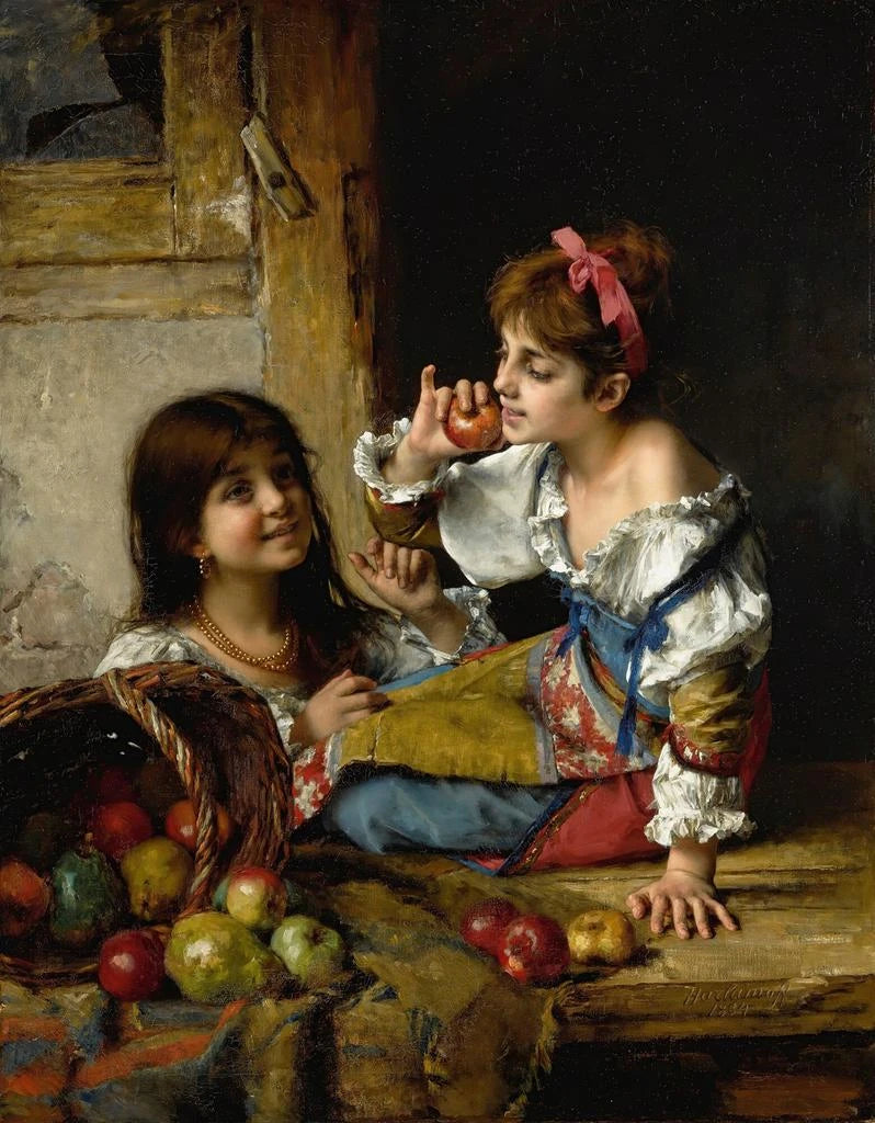 In the fascinating universe of art, some works manage to capture the very essence of humanity, revealing deep emotions through simple gestures and delicate expressions. "Two girls with apples and pears" by Alexei Harlamoff is one of those creations that invites contemplation. This artwork, painted at the end of the 19th century, features two young girls, united by innocence and curiosity, sharing a moment of complicity around juicy fruits. The vibrant colors and meticulous details of this scene evoke an atmosphere of sweetness and serenity, transporting the viewer to a peaceful world where nature and childhood meet.