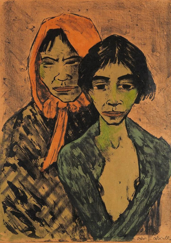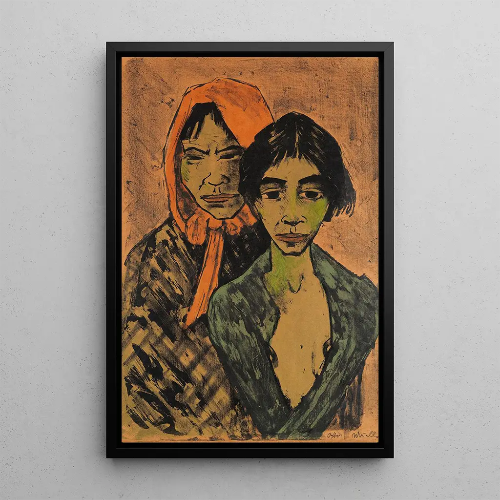 In "Two Romani women, mother and daughter," Otto Mueller captures the essence of nomadic life through a vibrant and emotive representation. The figures, draped in colorful clothing, are set in an environment that evokes freedom and wandering. The rich colors and dynamic textures bring this canvas to life, while the expressions of the characters convey a deep connection between the mother and her daughter. The artwork exudes a warm atmosphere, inviting the viewer to immerse themselves in the fascinating world of the Romani, while celebrating their culture and identity.