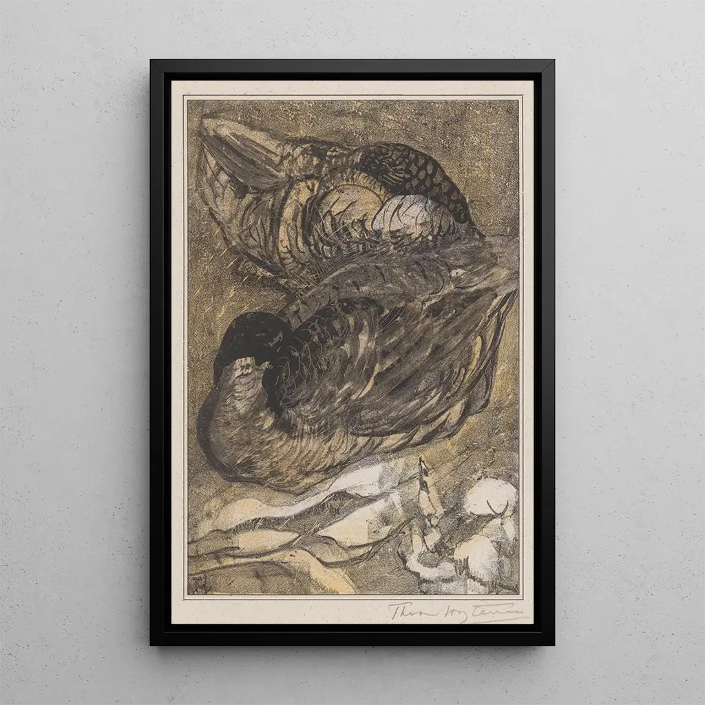 Two sleeping ducks: a moment of natural serenity In this delicate art print, Theo van Hoytema captures the essence of tranquility with his two sleeping ducks. The composition is harmonious, where soft shades of green and blue blend to evoke a sense of peace. The watercolor technique, with its fluid nuances, brings the scene to life while maintaining a dreamy atmosphere. The ducks, peacefully settled on the water, seem to float in a separate world, inviting the viewer to pause and contemplate this fleeting moment of nature. Theo van Hoytema: a master of naturalist observation Theo van Hoytema, a Dutch artist of the late 19th century, is renowned for his ability to capture the beauty of landscapes and animals. Influenced by the Impressionist movement, he developed a unique style that combines precision and poetry. His works, often inspired by nature, reflect a deep admiration for wildlife and flora. Van Hoytema was also a pioneer in the use of color and light, which allowed him to create captivating atmospheres. His artistic legacy endures, and his paintings, such as this art print of "Two sleeping ducks," continue to evoke an intimate connection with the natural world. A decorative acquisition with multiple assets The art print of "Two sleeping ducks" is an ideal decorative piece to bring a touch of serenity to your interior. Whether in a living room, office, or bedroom, this artwork invites relaxation and contemplation. Its reproduction quality guarantees fidelity to the colors and details of the original work, while adding an aesthetic dimension to your decor. With its subtle charm and soothing atmosphere, this canvas will appeal to all art and nature lovers, making it a perfect choice to enrich your living space.