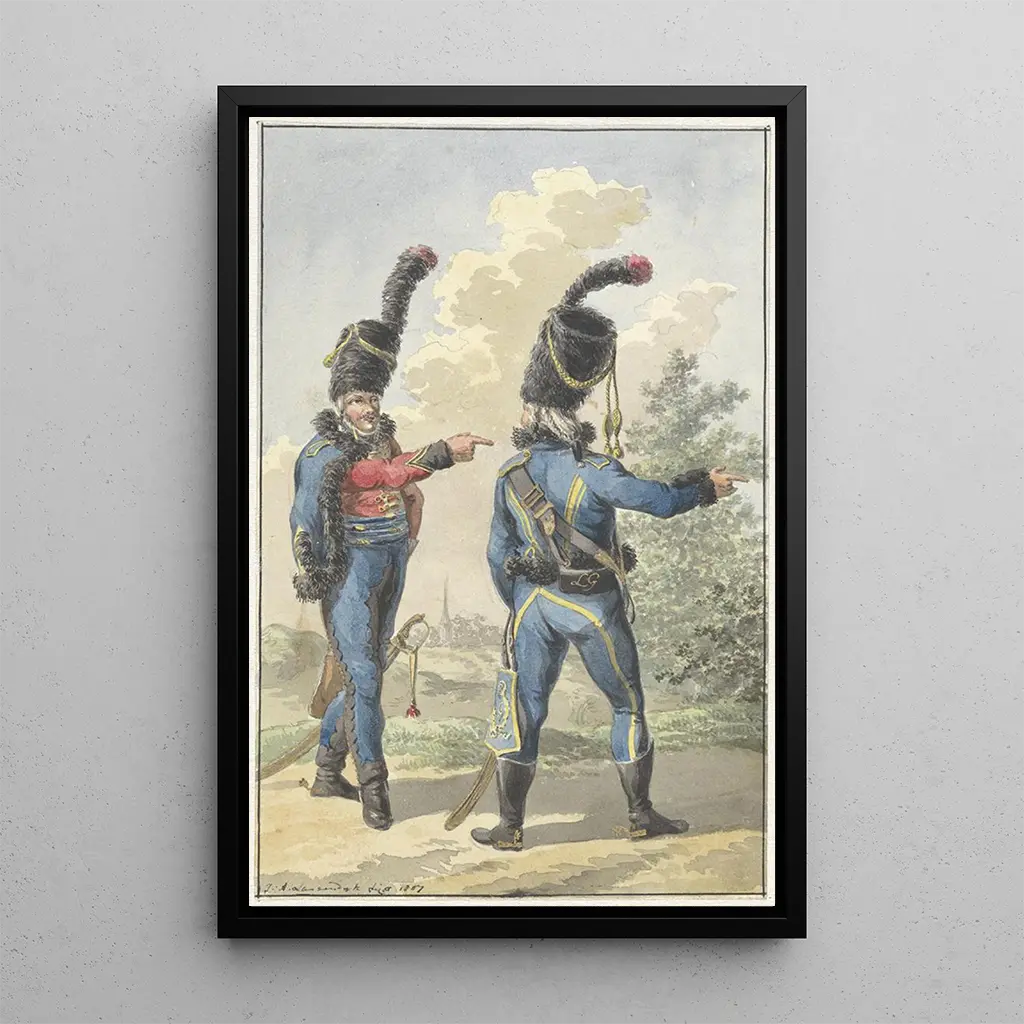 In the art print "Two standing soldiers," Jan Anthonie Langendijk presents a striking scene where two military figures stand proudly. The upright and confident posture of the characters evokes a certain authority and a sense of duty. The meticulous details of the uniforms, as well as the nuances of colors, create an atmosphere of respect and gravity. The light plays a crucial role, highlighting the features of the faces and the textures of the clothing. This artwork invites the viewer to contemplate not only the appearance of the soldiers but also the historical context surrounding them.