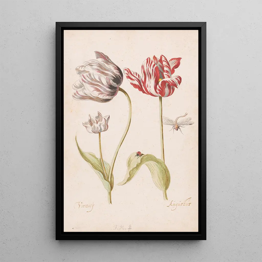 Two tulips with insects: a poetic depiction of nature in color In this captivating art print, "Two tulips with insects," Jacob Marrel transports us to the heart of a lush garden. The tulips, with their petals vibrant in red and yellow, bloom under a delicate lighting that highlights their velvety texture. The insects, meticulously painted, add a dimension of life and movement to the composition. Marrel, a master of detail, employs an oil painting technique that allows each nuance of color to be rendered with remarkable precision. The atmosphere of the piece evokes harmony between floral beauty and the fragility of nature, inviting the viewer to silent contemplation. Jacob Marrel: a pioneer of still life in the 17th century Jacob Marrel, born in 1613, was a Dutch artist renowned for his still life paintings. Active during the 17th century, he captured the richness of nature through his floral compositions. Influenced by the masters of Flemish painting, Marrel developed a unique style that combines realism and poetry. His works, including "Two tulips with insects," demonstrate the growing importance of still life in the art of his time. By incorporating elements of daily life, he helped elevate this genre to a new level, making his paintings highly desirable for collectors of the era. A decorative art print with multiple virtues The reproduction of "Two tulips with insects" is an ideal decorative piece to enhance your interior. Whether in a living room, office, or bedroom, this art print will add a touch of freshness and elegance to your decor. Its reproduction quality guarantees fidelity to the original details, allowing you to fully enjoy Marrel's work. With its undeniable aesthetic appeal, this canvas will delight your guests and enrich your living space, while evoking the ephemeral beauty of nature.
