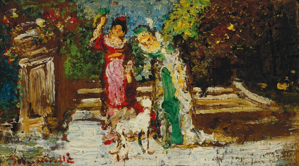The art print of Two Women and Dog by Adolphe Monticelli transports us to a moment of tenderness and complicity. The vivid colors and dynamic brushstrokes create a lively atmosphere, where the characters seem to come to life before our eyes. The canvas exudes a palpable warmth, thanks to the skillful use of warm tones that envelop the figures. Monticelli, with his unique style, manages to capture the essence of everyday life while adding a touch of poetry and dreaminess.