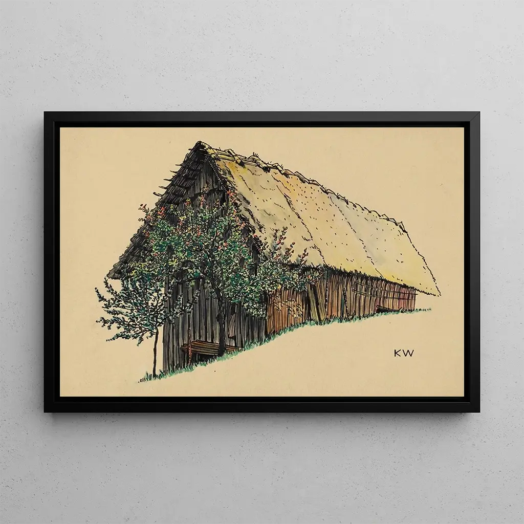 The art print of "Untitled, Wooden Barn" by Karl Wiener evokes a peaceful and timeless atmosphere. The canvas depicts a wooden barn, a symbol of rural life, with earthy colors that blend harmoniously into the surrounding landscape. The shades of brown and green create a warm ambiance, while Wiener’s technique, which combines realism and impressionism, brings this bucolic scene to life. The piece invites serene contemplation, where every detail, from the weathered wood to the cast shadows, tells a story of tradition and nature.