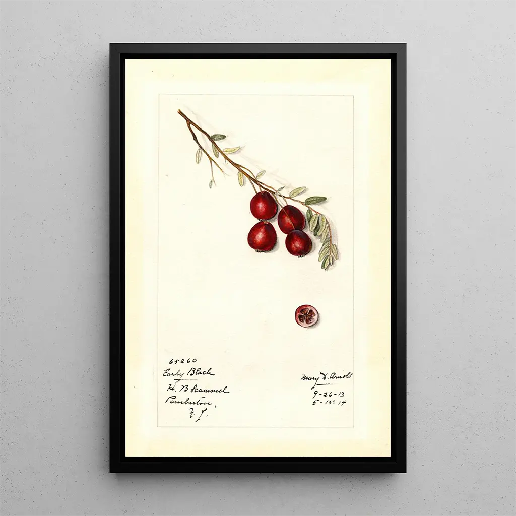 In this art print of Vaccinium macrocarpon Early Black, Mary Daisy Arnold immerses us in a vibrant universe where shades of red and green intertwine delicately. The composition highlights the juicy, almost radiant berries that seem ready to be picked. The artist's technique, blending watercolor and oil painting, creates an atmosphere that is both gentle and lively, evoking the freshness of autumn harvests. Every detail is carefully crafted, inviting the viewer to admire the simple yet striking beauty of these iconic fruits.