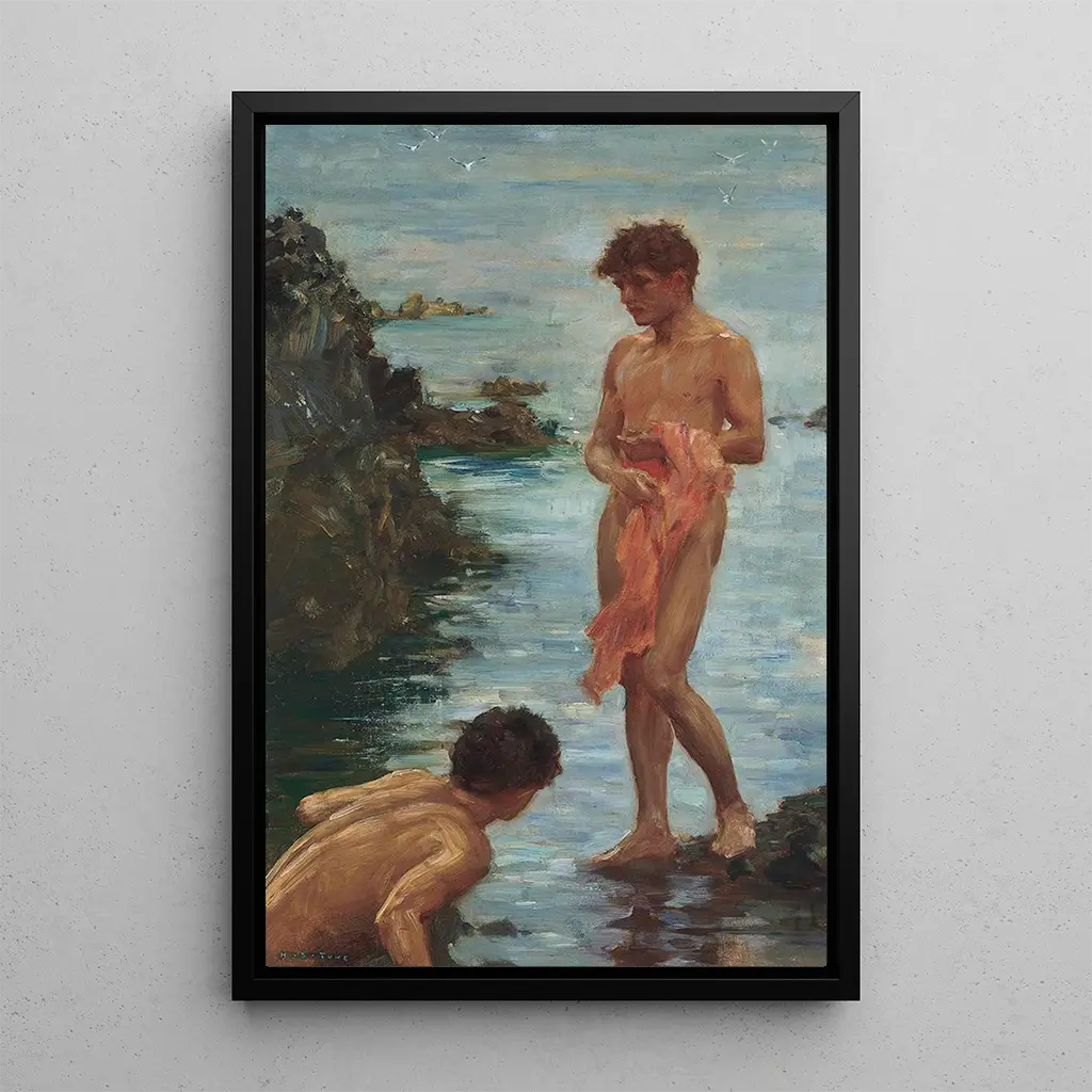 Varie on a group of bathers: a celebration of outdoor life In "Varie on a group of bathers," Henry Scott Tuke captures the essence of a sunny day at the beach. The canvas, bathed in light, depicts human figures lounging in crystal-clear waters, surrounded by lush natural scenery. The vivid colors and interplay of shadow and light create a joyful and lively atmosphere, inviting the viewer to feel the warmth of the sun and the coolness of the water. Tuke's technique, characterized by fluid and expressive brushstrokes, brings each detail to life, from water splashes to reflections on the sun-tanned skin of the bathers. Henry Scott Tuke: the artist of seaside pleasures Henry Scott Tuke, a British painter active in the late 19th and early 20th centuries, is renowned for his depictions of coastal life and young men outdoors. Influenced by Impressionism and the Pre-Raphaelite movement, Tuke captured the beauty of nature and the sensuality of his models. His works, often inspired by the Cornwall region, reflect a time when art and everyday life intertwined. Exploring themes of youth, freedom, and natural beauty, Tuke left a lasting legacy in the art world, celebrating the simple joy of existence. A decorative acquisition with multiple assets The art print of "Varie on a group of bathers" is an ideal decorative choice for various spaces such as the living room, office, or even a bedroom. Its faithful print quality and vibrant colors bring a touch of freshness and vitality to your interior. This artwork evokes summer memories and invites relaxation, creating a welcoming and serene atmosphere. By adding this canvas to your collection, you do more than beautify your space—you also offer a window into a world of beauty and pleasure, conducive to escape and contemplation.