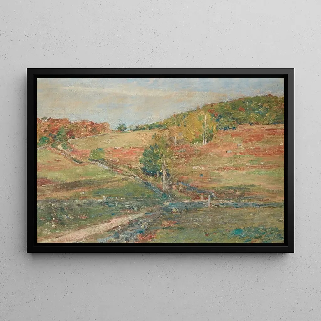 The art print Vermont Hill transports the viewer to an idyllic landscape, where nature flourishes under a bright sky. The shades of green of the hills blend harmoniously with the touches of blue in the sky, creating a serene and calming atmosphere. Theodore Robinson's impressionist technique is evident through fluid brushstrokes that capture the light and movement of the leaves. This piece evokes an invitation to contemplation, where every detail seems to breathe the tranquility of a sunny day.