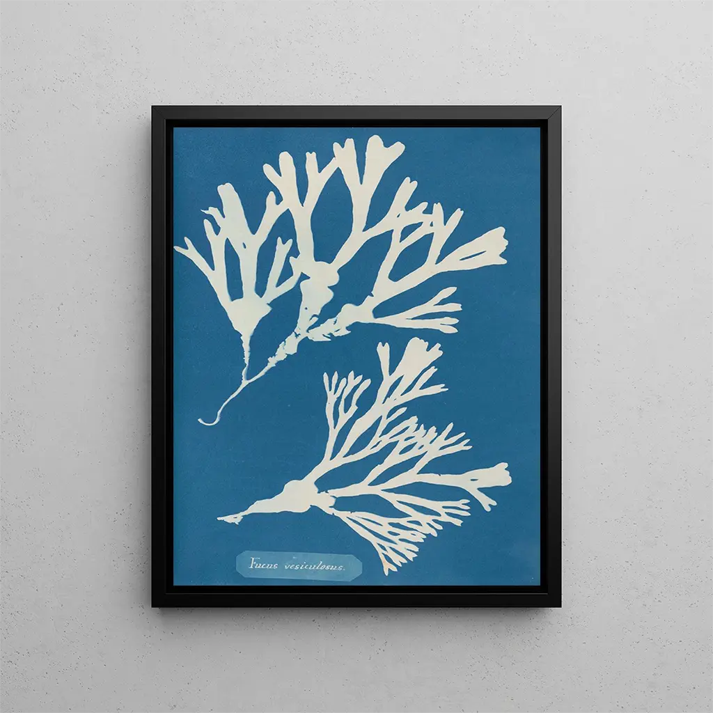 Encre vésiculaire - Anna Atkins – Introduction captivante L'œuvre "Encre vésiculaire" d'Anna Atkins se dresse comme un témoignage poignant de l'intersection entre l'art et la science. Dans un monde où l'expérimentation visuelle et la rigueur scientifique s'entrelacent, Atkins a su capturer la beauté éphémère des formes naturelles à travers une technique novatrice. En utilisant le cyanotype, une méthode de photographie primitive, elle a donné naissance à des compositions d'une délicatesse rare, révélant la fragilité et la complexité du monde végétal. Cette œuvre, tout en étant une exploration esthétique, est aussi un hommage à la botanique, une discipline qui fascine depuis des siècles. La reproduction Encre vésiculaire - Anna Atkins permet ainsi d'immerger le spectateur dans un univers où chaque détail est soigneusement observé et mis en lumière. Style et singularité de l’œuvre L'œuvre d'Atkins se distingue par son approche unique de la représentation botanique. Le cyanotype, qu'elle a maîtrisé, offre une palette de bleu profond, évoquant à la fois le ciel et l'eau, des éléments essentiels à la vie. Chaque impression est le résultat d'une observation minutieuse, où les formes des algues et des plantes sont délicatement mises en valeur par un contraste saisissant. Les silhouettes, à la fois simples et complexes, semblent danser sur la page, révélant des textures et des nuances qui captivent le regard. Ce style, à la fois scientifique et poétique, transcende les frontières traditionnelles de l'art, faisant de chaque pièce une œuvre d'art à part entière. La capacité d'Atkins à fusionner l'art et la nature lui confère une place unique dans l'histoire de l'art, où chaque impression devient une invitation à contempler la beauté du monde naturel. L’artiste et son influence Anna Atkins, souvent considérée comme la première femme photographe, a ouvert la voie à de nombreuses artistes qui ont suivi ses traces. Son travail, ancré dans le XIXe siècle, est le reflet d'une époque où la curiosité scientifique et l'esthétique artistique commençaient à se rencontrer. En tant que pionnière, elle a non seulement documenté des espèces végétales, mais a également remis en question les conventions de son temps, prouvant que la photographie pouvait être un médium artistique à part entière. Son influence perdure aujourd'hui, inspirant des générations d'art