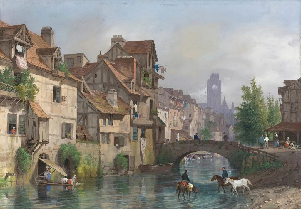 Giuseppe Canella's art print of the Vue de Rouen offers an immersive experience into the timeless charm of this Norman city. The pastel hues, blending shades of blue and pink, evoke a soft and dreamy atmosphere. The oil painting technique captures the reflections of light on the historic buildings and the Seine River, creating a sense of depth and movement. Canella manages to capture the essence of Rouen, with its picturesque alleys and iconic monuments, inviting viewers to stroll through its urban landscapes.