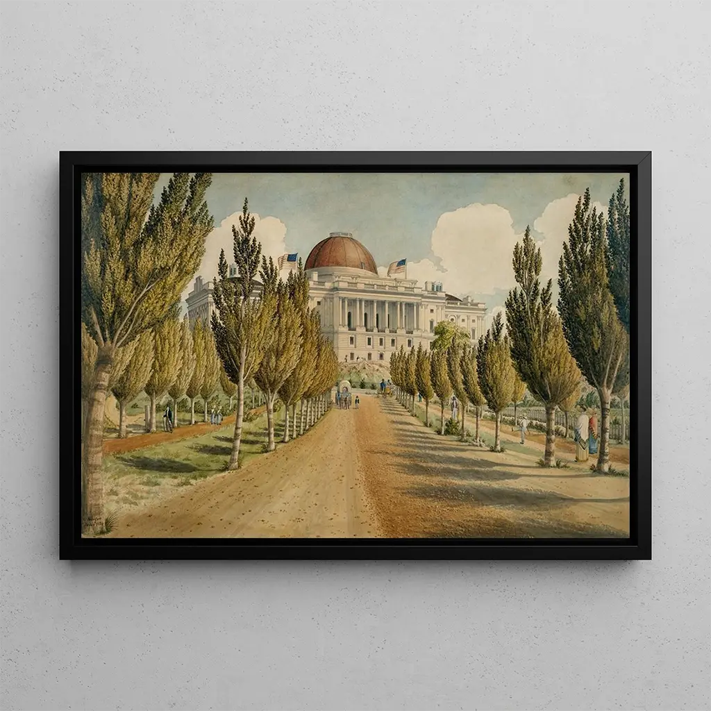 The art print of "Vue du Capitole" by Charles W. Burton offers an immersion into the iconic architecture of Washington D.C. This painting, rich in detail, highlights the Capitol, a symbol of American democracy. The vibrant colors and play of shadows create an atmosphere that is both solemn and lively. Burton's technique, blending realism and romanticism, allows viewers to feel the grandeur of the building while being transported by the beauty of the surrounding landscape. Every brushstroke seems to tell a story, inviting the viewer to contemplate not only the structure but also the historical context that surrounds it.