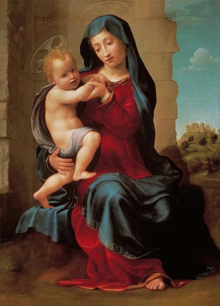 La Vierge à l'Enfant de Giuliano Bugiardini est une œuvre qui respire la douceur et la sérénité. Dans cette représentation, la mère et l'enfant sont enveloppés d'une lumière douce, accentuant la délicatesse des traits. Les couleurs pastel, mêlant des nuances de bleu et de rose, créent une atmosphère apaisante. La technique de la peinture à l'huile permet de rendre les textures des vêtements et la peau avec une finesse remarquable. Chaque détail, du regard complice entre la Vierge et l'Enfant à la manière dont les drapés tombent, invite le spectateur à une contemplation profonde et émotive.