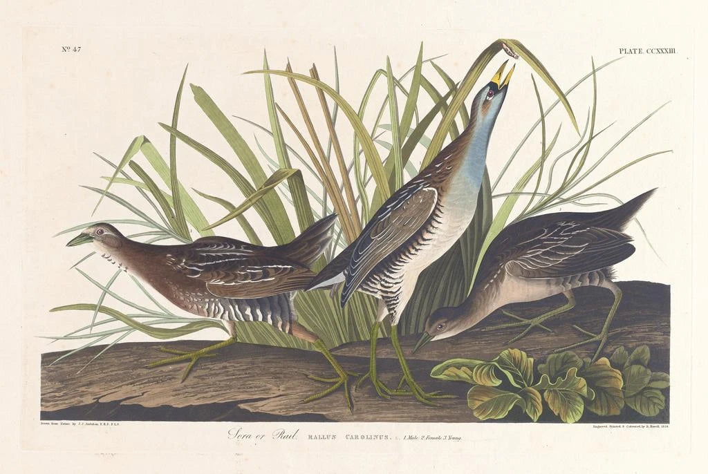 John James Audubon, born in 1785 in Haiti, is recognized as one of the greatest naturalists and artists of the 19th century. His revolutionary work in the field of ornithology set standards for the observation and representation of birds. Influenced by Romanticism and the wild nature of America, Audubon dedicated his life to capturing the beauty of bird species through detailed illustrations. His flagship work, "The Birds of America," marked a turning point in naturalist art, combining science and aesthetics. Virginia Rail fits into this tradition, demonstrating his commitment to the preservation of nature.