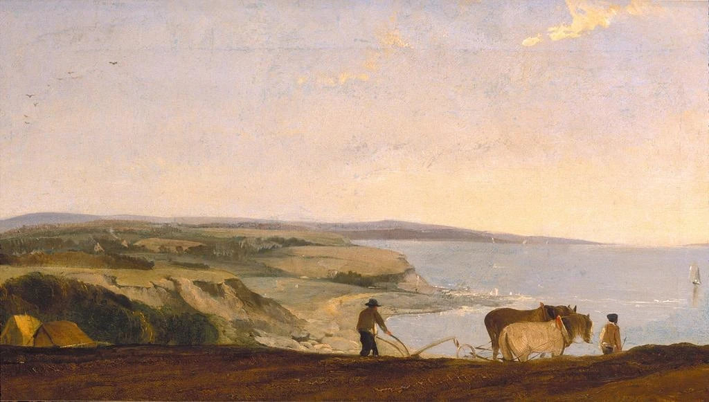 The art print of Near Weymouth view transports the viewer to a peaceful landscape, where the soft morning light illuminates the green hills and calm waters. The shades of green and blue blend delicately, creating an atmosphere of tranquility and contemplation. The oil painting technique, characteristic of John Crome, captures the subtle details of nature, from foliage to reflections in the water. This artwork invites you to escape, breathe in the fresh English countryside air, and enjoy the simple, authentic beauty of the natural world.
