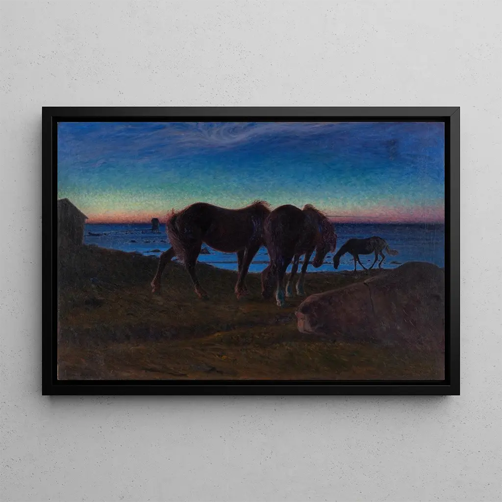 The art print of "Pasture by the Water's Edge" is an ideal choice to enhance your interior, whether in a living room, office, or bedroom. Its printing quality guarantees remarkable fidelity to the colors and details of the original work, adding a touch of elegance and serenity to your space. This art print, with its undeniable aesthetic appeal, will delight your guests and create a calming atmosphere, conducive to relaxation and contemplation.