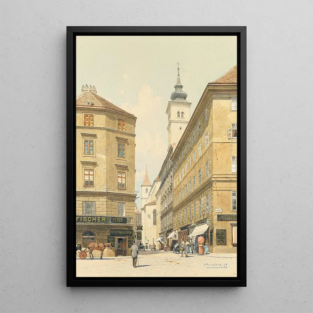 The art print of Weihburggasse by Franz Poledne immerses us in the heart of a lively urban scene, where vibrant colors and meticulous details capture the essence of a lively day. The buildings, with richly decorated facades, stand proudly under a clear blue sky, while passersby add a palpable dynamism to the composition. Poledne's technique, blending impressionism and realism, creates a warm and welcoming atmosphere, inviting the viewer to get lost in the alleys of this city. Each brushstroke seems to tell a story, making this canvas a true art print of life.