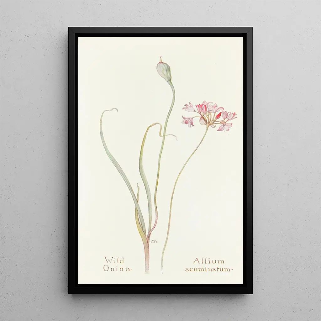 The art print "Wild Onion" by Margaret Armstrong presents itself as a delicate watercolor where shades of green and violet blend harmoniously. The composition, centered on the flowering onion, evokes a lightness and freshness typical of springtime landscapes. The meticulous details of the petals and leaves, rendered with subtle technique, invite a soothing contemplation. The overall atmosphere of the canvas is imbued with a softness reminiscent of walks in the fields, where nature blooms in all its splendor.