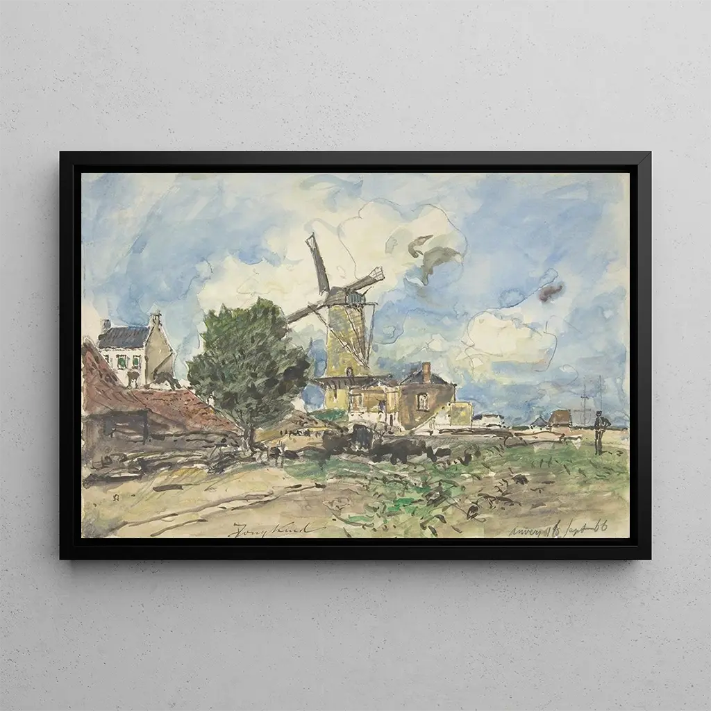 Antwerp Windmill: A Dance Between Sky and Earth The art print "Antwerp Windmill" by Johan Barthold Jongkind immerses us in a landscape where nature and architecture meet harmoniously. The vivid colors and dynamic brushstrokes evoke a lively, almost tangible atmosphere. The majestic windmill stands proudly against a cloudy sky, while the surrounding fields seem to vibrate under the breath of the wind. Jongkind, a pioneer of Impressionism, employs an oil painting technique that captures light in a unique way, creating a sense of movement and vitality. This art print invites contemplation, revealing the beauty of Dutch landscapes through a poetic gaze. Johan Barthold Jongkind: a pioneer of Impressionism Born in 1819 in the Netherlands, Johan Barthold Jongkind is often regarded as one of the forerunners of Impressionism. His artistic career began at a time when realism and romanticism dominated, but he quickly moved away from these movements to explore light and color in an innovative manner. Influenced by artists such as Turner and Constable, Jongkind developed a unique style that combines precision and expressiveness. His contribution to art is significant, inspiring many artists, including Claude Monet. By painting marine and rural landscapes, he captures the essence of nature, making him an essential figure of the 19th century. A decorative piece with multiple assets The art print of "Antwerp Windmill" is a decorative piece that fits perfectly into various spaces such as the living room, office, or bedroom. Its faithful print quality and aesthetic appeal make it an ideal choice for those who wish to add an artistic touch to their interior. This art print, with its vibrant colors and serene atmosphere, creates a warm and welcoming environment. By choosing this canvas, you opt for a work that not only beautifies your space but also tells a story — that of a visionary artist and the beauty of Dutch landscapes.