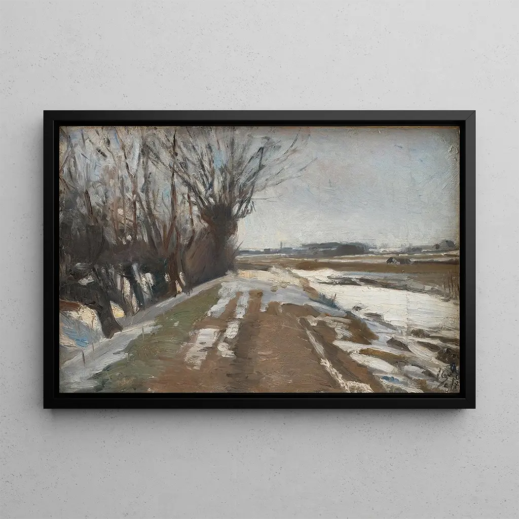 The painting "Winter Landscape at Utterslev near Copenhagen" by Albert Gottschalk evokes a peaceful and contemplative atmosphere. The cool shades of blue and white dominate the composition, creating a striking contrast with the touches of brown in the bare trees. The oil painting technique imparts a rich texture, while the diffused light seems to filter through the clouds, delicately illuminating the snowy landscape. This art print invites an imaginary walk in a winter setting, where the silence of nature blends with the beauty of snowflakes.