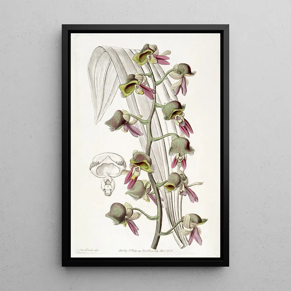The art print of the Fleur de moine terne immerses us in a universe of softness and serenity. The pastel shades, ranging from tender green to delicate pink, blend with a lightness that evokes the fragility of this plant. The lithography technique, used by Sydenham Edwards, captures the intricate details of the petals and leaves, creating an almost dreamlike atmosphere. Each element seems to dance under the light, inviting the viewer to a peaceful contemplation. This piece is much more than a simple botanical representation; it is an ode to the ephemeral beauty of nature.