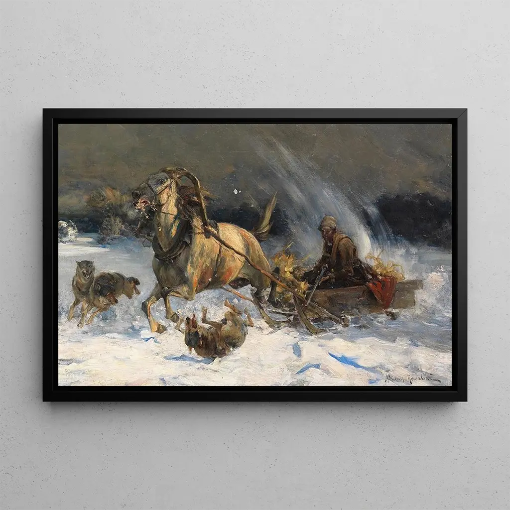The art print "Attack of the wolves" by Alfred von Wierusz-Kowalski immerses the viewer in a scene of dramatic tension, where the wild nature unfolds with force. The composition, focused on the wolves in motion, is enhanced by dark colors and shades of gray that evoke the coldness of winter. The artist's technique, blending realism and romanticism, allows one to feel the intensity of the moment. The meticulous details of the animals and the surrounding landscape create an immersive atmosphere, where each element contributes to the storytelling of this wild hunt. This art print is a true homage to the beauty and cruelty of nature.