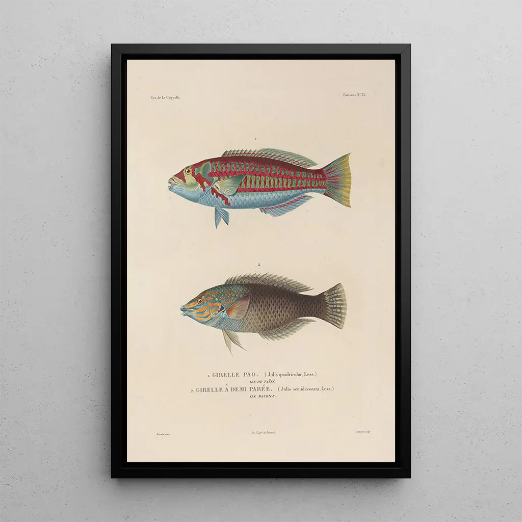 This art print of the painting "Voyage around the world Pl042" by Louis-Isidore Duperrey immerses us in a captivating maritime atmosphere. The shades of blue evoke the ocean depths, while touches of white and beige illustrate the sails of ships sailing on the waves. The dynamic composition, with its flowing lines and meticulous details, invites the viewer to imagine adventure and discovery. Each element of the canvas seems to tell a story, that of a journey through exotic landscapes and distant horizons, where the sea becomes the stage for human exploration.