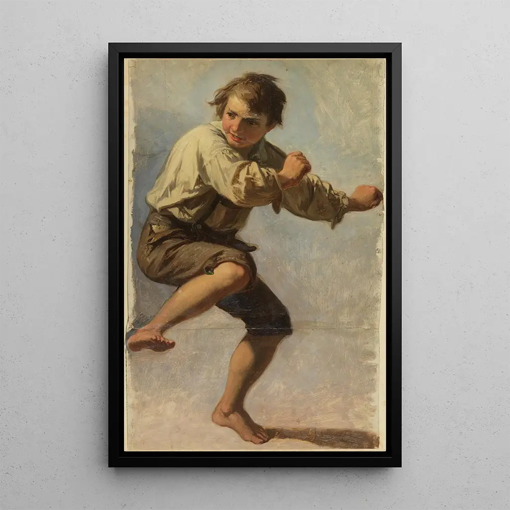 In this captivating artwork, "Young Farmer in a Defensive Stance," Johann Baptist Kirner immerses us in a scene filled with tension and determination. The young man, frozen in a defensive posture, evokes an atmosphere of struggle and challenge. The earthy colors and dark shades enhance the intensity of the moment, while Kirner's technique, marked by striking realism, brings this iconic character to life. Every detail, from the determined gaze to the folds of his clothing, tells a story of bravery in the face of adversity.