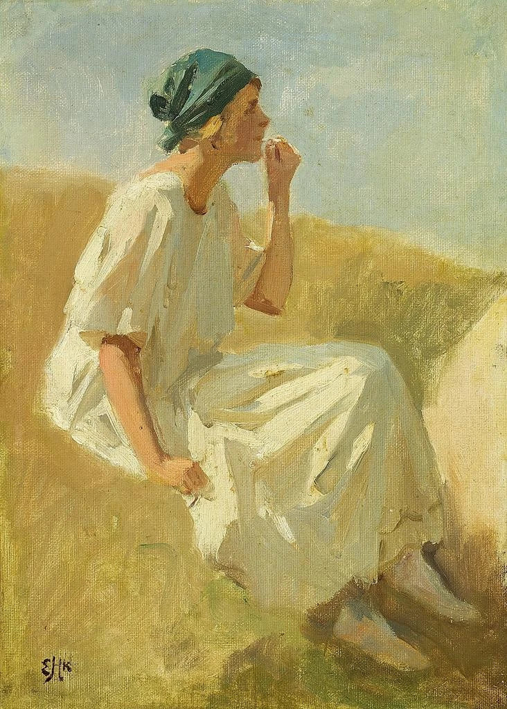 Painting Young girl sitting with a green scarf - Erik Henningsen | Art print