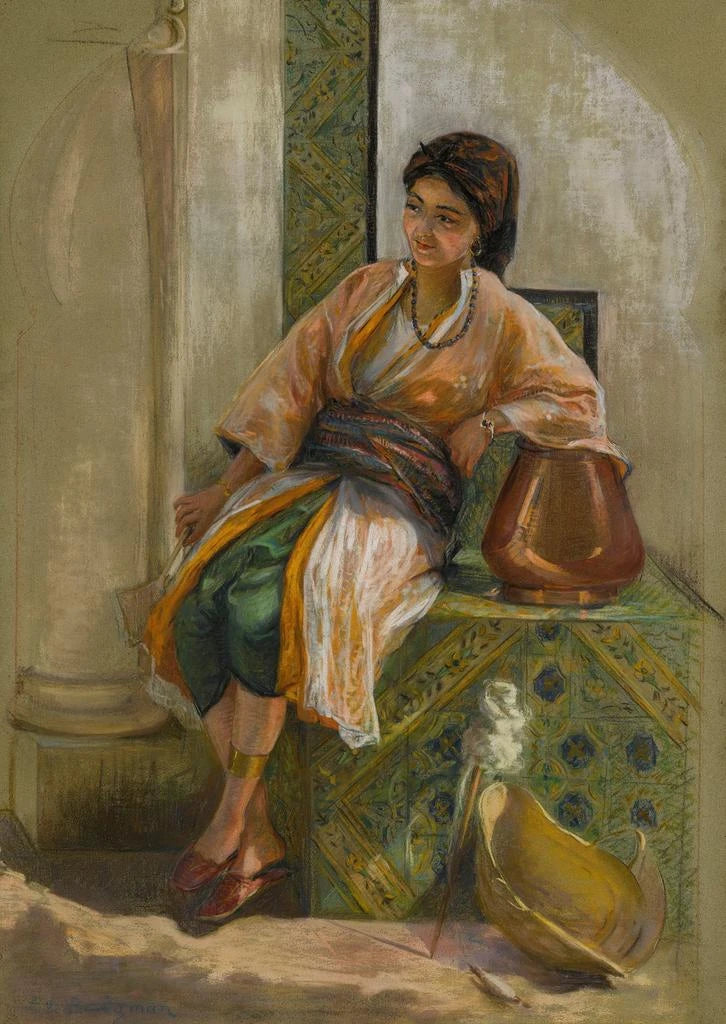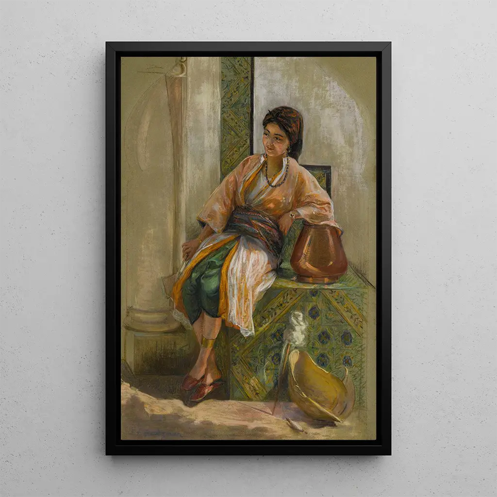"Young Girl with a Fan" by Frederick Arthur Bridgman is an art print that embodies grace and feminine beauty. The composition features a young woman, elegantly dressed, holding a delicate fan that seems to catch the light. The soft pastel colors, combined with brighter touches, create a light and dreamy atmosphere. Bridgman's technique, blending realism and impressionism, allows you to feel the texture of the clothing and the delicacy of her model's features, offering an immersion into a moment of visual poetry. Frederick Arthur Bridgman: a master of Orientalism Frederick Arthur Bridgman, active at the end of the 19th century, is an American painter whose work is deeply marked by Orientalism. Influenced by his travels in North Africa and the Middle East, he was able to translate the beauty of Eastern cultures through his paintings. His style, which combines realistic elements with impressionist touches, allowed him to stand out in the artistic scene of his time. "Young Girl with a Fan" is a perfect example of his talent for capturing the essence of his subjects while integrating elements of dream and mystery, making him a major figure of this artistic movement. A decorative art print with multiple assets The reproduction of "Young Girl with a Fan" is a decorative piece that will enrich your living space. Whether in a living room, bedroom, or office, this canvas adds a touch of elegance and refinement. Its reproduction quality ensures fidelity to the details and colors of the original artwork, allowing you to fully enjoy its charm. With its aesthetic appeal, this art print becomes a central element of your decoration, inspiring admiration from your guests and inviting daydreams.