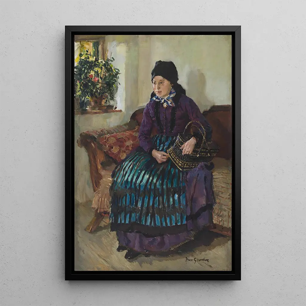 The art print "Young Peasant Girl at the Window" by Hermann Groeber depicts a young woman, peacefully seated at her window, lost in thought. The soft, natural colors, dominated by shades of green and earth tones, create a warm and intimate atmosphere. The light filtering through the window highlights the delicate features of her face, while the background evokes a rural landscape, symbolizing simplicity and tranquility. This artwork invites silent contemplation, where every detail seems to tell a story of daily life.