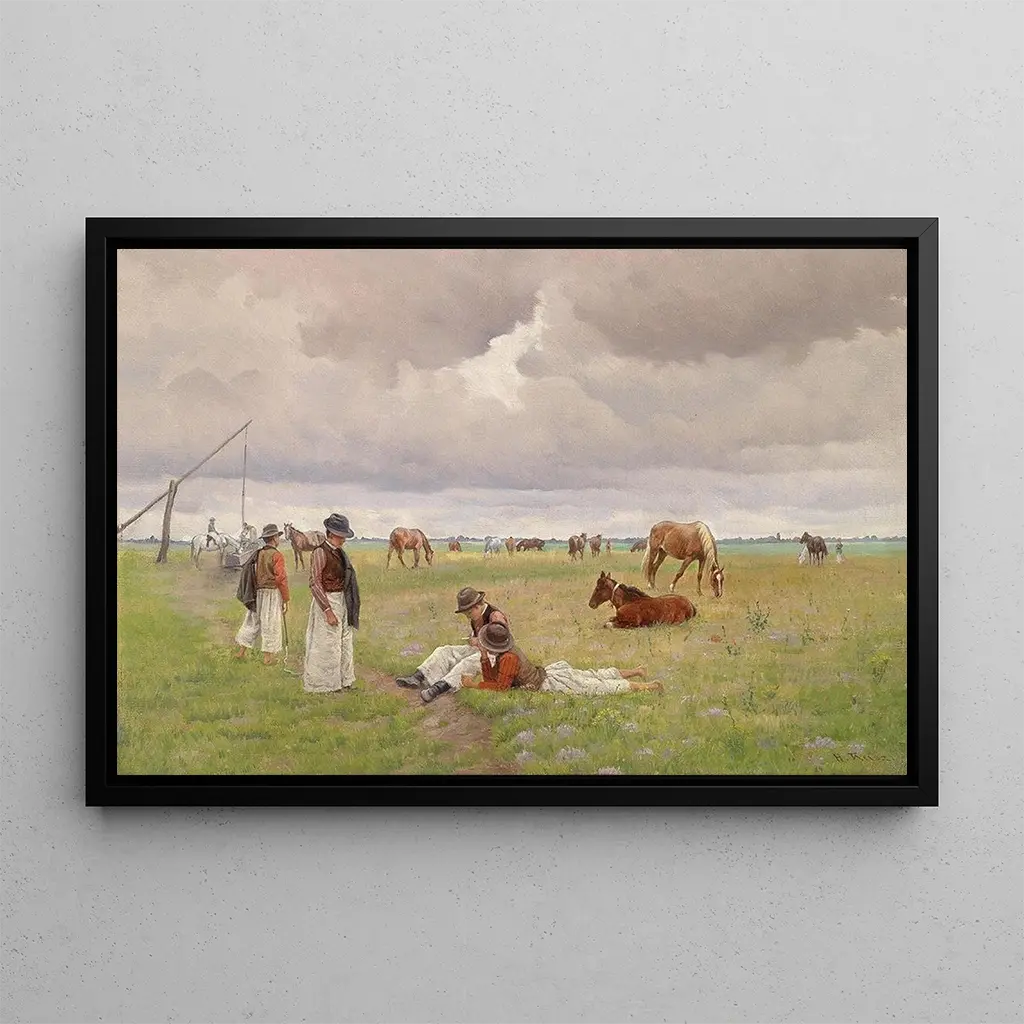 In this art print of the work "Young Shepherds in the Puszta," Hermann Reisz transports us to the heart of the vast Hungarian plains. The canvas depicts two young shepherds, surrounded by lush nature, where soft and warm colors blend harmoniously. The shades of green, yellow, and brown create a peaceful, almost dreamlike atmosphere, inviting contemplation. Reisz's technique, which combines realism and impressionism, allows us to feel the sunlight filtering through the trees, adding a lively dimension to this idyllic scene.